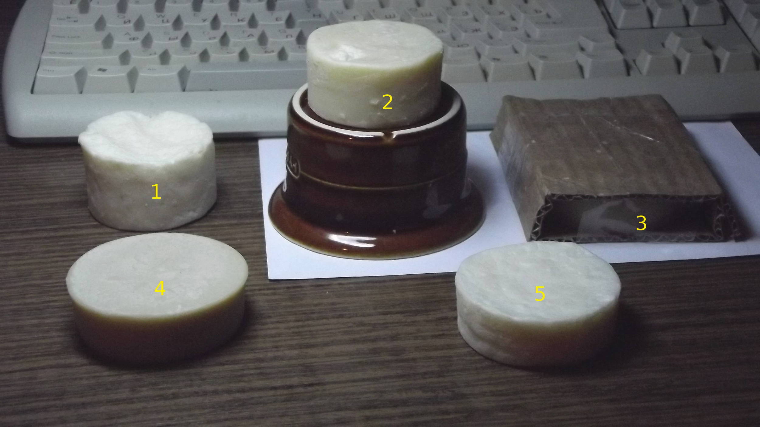 Re: "Да здравствует мыло душистое" (самодельное)1. говядина плюс Арко 2. растительный вер 2 плюс Арко 3. вер 2 плюс "ерипень по рамбулу" 4. вер 2 плюс воск и "ерипень по рамбулу" 5. смесь стружки титров говядины барана косули кукурузы эколакта От пен, кремов и гелей мы имеем мертвый эпителий.
