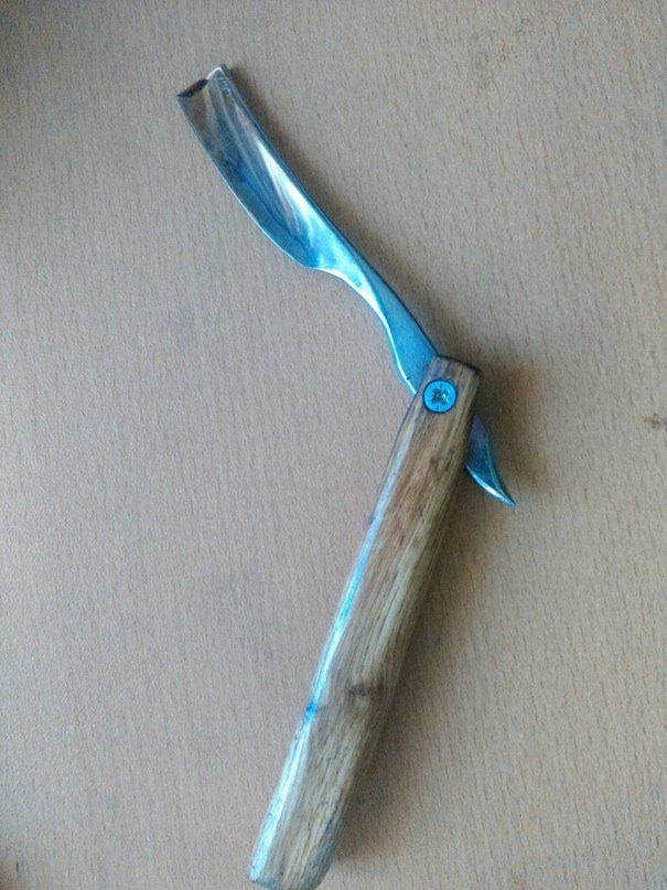 Re: Мнения по поводу стали для изготовления бритв.Ну изготовил сие изделие пробным лет 8 назад. Причем на коленках в самом прямом смысле. Из техники использовался только старый наждак из движка от стиралки. Винт вкрутил с год назад как нашел бритву при копании в железках. Лезвие было мягкое, решил закалить. Кромку немного повело. Но бреет бритва очень достойно и комфортно. Из за того что это моё первое детище выложил в контакт.