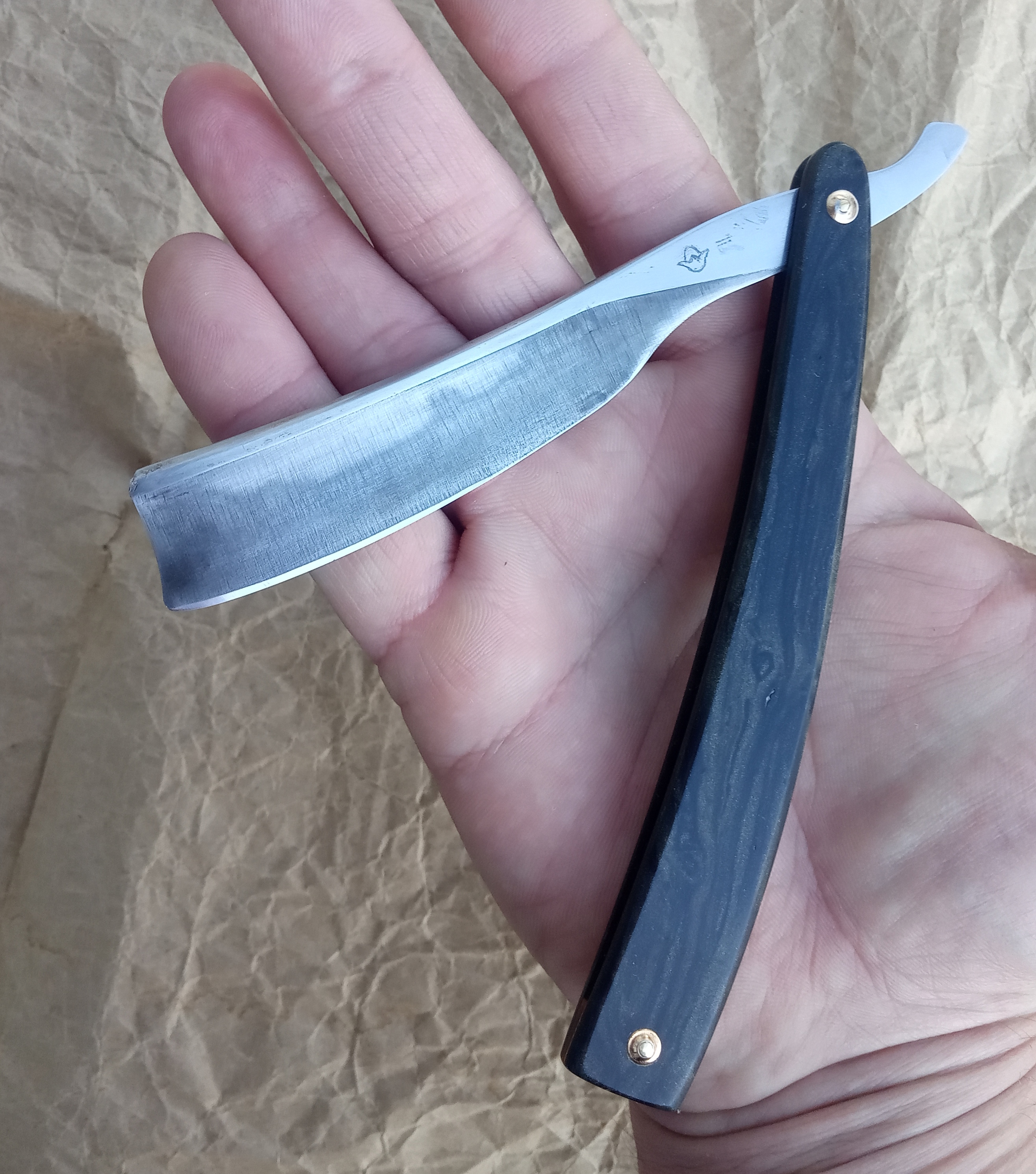 Мечтаю изготовить бритвуВот и сбылась мечта... Мой первенец многотрудный. Напильник У12 разрезал. Был доступ к гриндеру. Ободрал контуры и грубые спуски. Отправил на термичку. Зонная закалка в шестьдесят HRC. Потом самые прикольные моменты работы на колен. Станочка пока нема и обдирал дрелью с лепестклвым диском (дураков работа любит). Получил 3/4 клин 22мм. Обух от шести мм на сужение. Оправу поставил из смолы собственной заливки. Заточил. Пока не опробовал