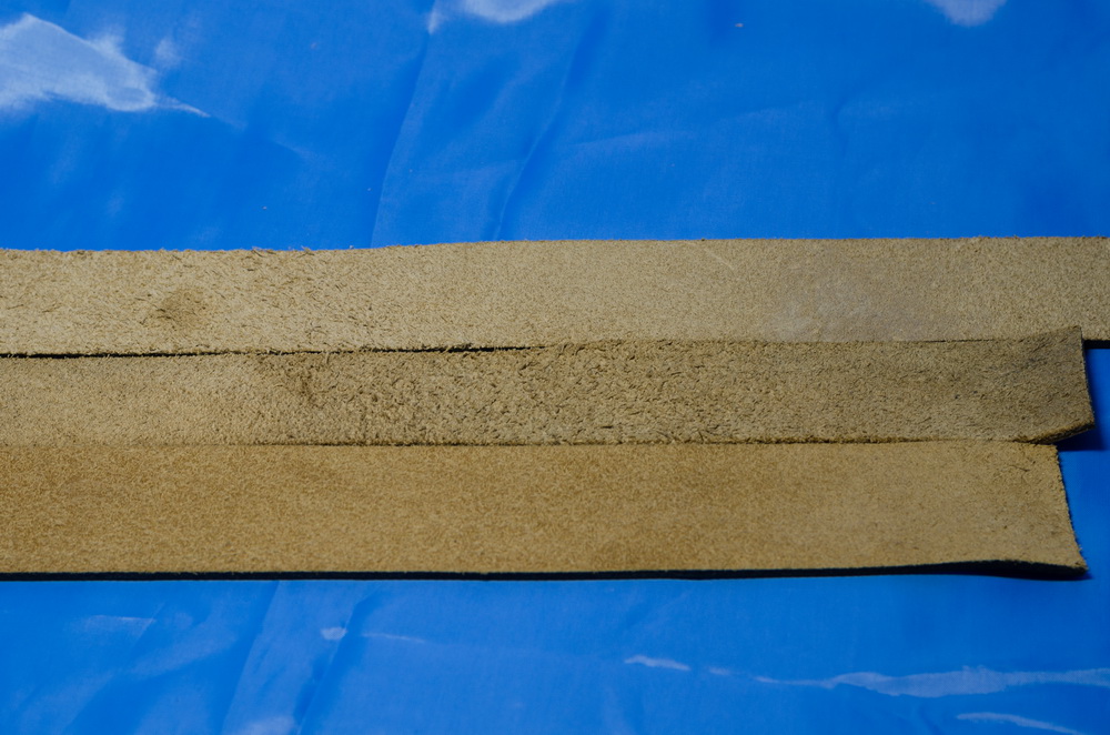 Полоска мне попалась занятная. Лицевая, покрашенная черной краской сторона, особого интереса не вызвала. Оборотная, при рассмотрении, порадовала тремя четко выраженными зонами: зоной ровного, гладкого, почти неощутимого ворса; зоной дикорастущего буйного ворса; и, наконец, зоной, где все перемешалось. Все три участка были примерно одинаковой длины, и, будучи отрезанным, каждый участок пострадал по-своему. Часть с ровным ворсом подверглась ошкуриванию с нисходящей зернистостью, небольшой обработке маслом, еще раз ошкуриванию меленькой наждачкой, заглаживанию стеклянной банкой. В результате, после всех операций у меня появился ремень для правки, 40 сантиметров длиной, с ровной бархатной поверхностью, по которой очень прикольно было гонять вперёд-назад пальцем. Бритва по этому ремешку ходила с мягким, шелестящим звуком, слегка «прилипая» во время движения, и таки-да, эффект был. Бритва прАвилась. До сего момента, в моем правильно-ременном арсенале имелась только китайская поделка с ибаёв и советский ремень для правки. Эффект от нового ремня был более выражен, работать с ним было приятнее, в общем, первая часть эксперимента удалась. Подошла очередь буйно-лохматой заготовки. После многократных, не приведших к успеху, попыток умерить буйство ворса, я решил заняться обратной, окрашенной стороной. Натянул полоску на доске, смочил немного, и попытался избавить от краски. Не тут-то было. Краска, конечно, сходила, но в ремне обнаруживались какие-то глубокие ямы, залитые краской. Вышкуривание ям приводило к заметному снижению толщины полоски. В общем, добившись, в массе, ровного цвета поверхности без краски, махнул рукой на недошкуренные прожилки. Накрыл все газетами, прижал грузом и оставил сохнуть на ночь. На следующий день снял с фиксаторов многострадальную заготовку и с удивлением увидел, что ее всю перекосило. Из прямоугольной заготовка стала какой-то кляксообразной, к тому же мягкой, как тряпочка. Отступать было неинтересно, поэтому геометрию поправил обрезанием с боков, саму заготовку прошкурил, чуть промаслил, откатал бутылкой и приделал карабинчик. К сожалению, результат разочаровал. По ремешку бритва ходит мягко, как-то беззвучно, что ли. Результата от правки на этой поделке я так и не ощутил. Неудачка. Осталась третья заготовка, с переменной растительностью. Пока думал, чего бы из нее сотворить, почти машинально отшкурил от краски. На удивление ровно и хорошо отшкурилось, а с обратной стороны тоже ровно отшкурился ворс. После недавней темы отрезал самый лохматый кусок и сотворил пару заготовок для чи-апекса. Совершенно нормально работают, как родные. Осталось найти где-нибудь кусок фетра и попробовать оставшуюся полоску приспособить на дощечку, под пасту. Шапку банную распороть, что ли?
