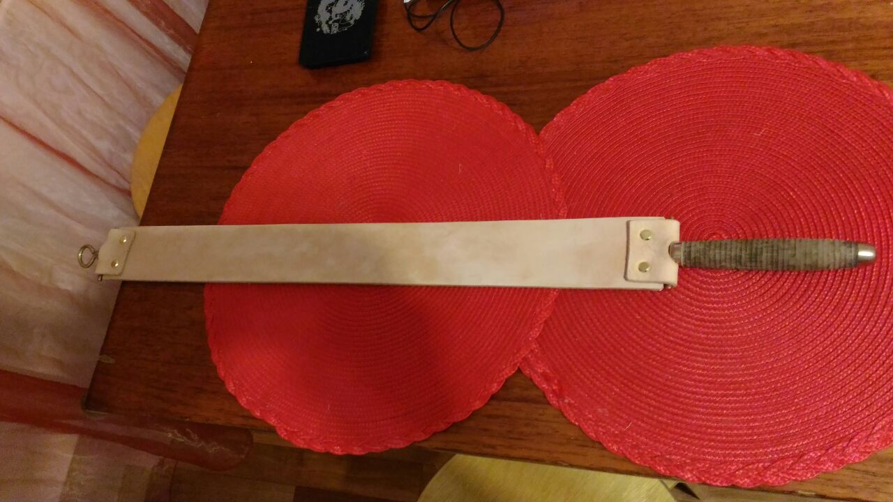 Re: Изготовление ремней для правкиОбзавелся ремешок и ручкой и подвесом-шарниром. Все самодельное на коленке. Полоса кожи - растишка от unsui - 65х600х5мм - Поклон ему и благодарность Шкурка 800-1500-2000 и потом чуть заполирована куском кожи. Много фото процесс кому интересны детали Show продолжение Show