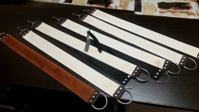 Изготовление ремней для правкиВот что получается, кожа итальянская КРС раст. дубления, чепрачная часть, 3.7 мм. Трижды прокатана ручными валками со ступенчатым уменьшением зазора, лицо выровнено циклей и потом наждачками до Р2500, потом легкое смазывание тампоном с костным маслом. Крепежи, ну тут понятно - хольнитены, полукольца, карабины, элементы из натуральной коричневой кожи. Сделал версию с доп. синтетической стропой и бюджетную версию из турецкой крашеной 3 мм кожи. Материала еще осталось ремней на 30, технологию отработал, можно делать без проблем