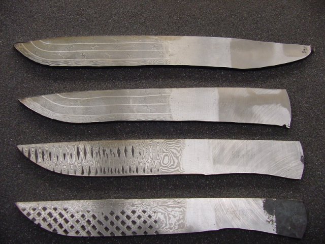 А если у кого есть, что сказать в техническом плане по "даммаску", ждём. Я же настаиваю, что делать сектора и слои в бритве с разной степенью твёрдости (даммаск) - наитупейшее занятие, бритвы не будет. Потому люди просто сковывают индентичные бруски, потом вытравливают узор. Качество стали повышается из за слоённости и чистоты стали, т.к. ковка убирает примеси из стали. Суть же даммаска именно в спаивании брусков с разной твёрдостью, остриё из твёрдых брусков преимущественно, обух и сердцевина из мягких, благодаря чему меч может иметь одновременно - и твёрдое остриё с хорошей заточкой и не ламаться от удара.