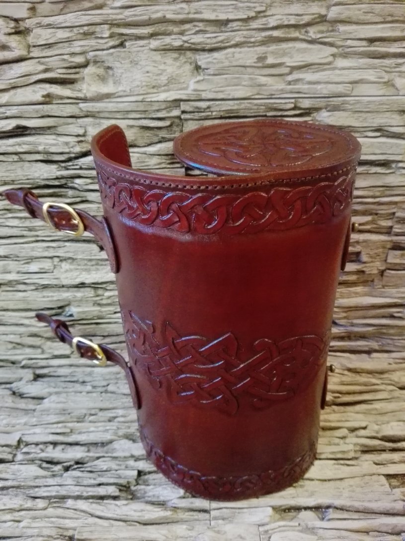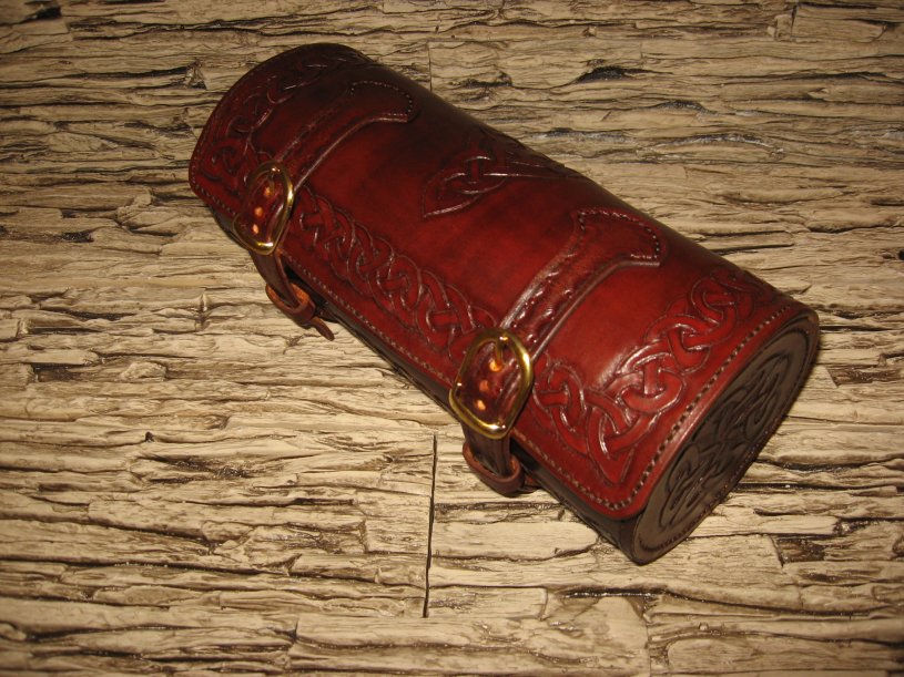 Нессер выполненный из натуральной кожи растительного дубления, украшен тиснением кельтского орнамента. Вмещает в себя недельный запас бритв, чашу для бритья, ремень, помазок в футляре, кругляш мыла. Все качественно сшито и обработано восковыми составами. Можно приобрести у Wren, если вдруг кого заинтересует.