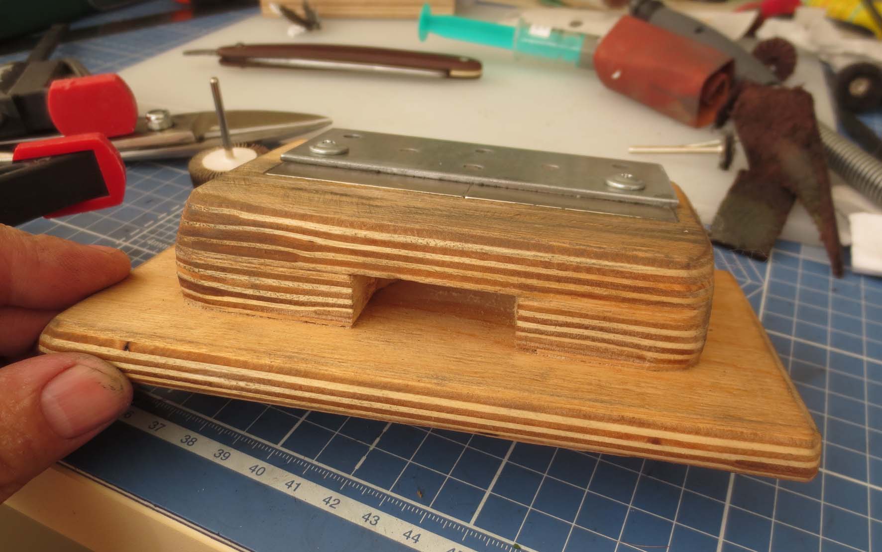 Магнитная подставка для полировки бритвПопробовал изготовить подставку для полировки бритв. На 10 мм. фанеру наклеил кусок линолеума толщиной такой же как и неодимовые магниты, которые вклеил в вырезанные отверстия в нем. Получился вот такой полуфабрикат. Магниты можно даже не закрывать т.к. их плоскость совпадает с поверхностью линолеума. Осталось приклеить деревянную линейку ограничитель и резиновые ножки снизу подставки..