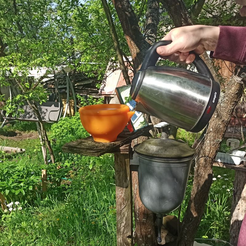 Кружка для бритья из силиконаПовез младшенького на дачу к бабушке в Тверь. Кстати если кто в Твери есть, можно встретиться. Побрился в походных условия. Я уже писал, что я бреюсь месяц примерно, это про то как я умею.. Наверное что то не так делаю, но я не об этом. На даче нет ГВ, дальше по фото можете посмотреть. Лью кипяток из чайника в носик, ничего не пролил. Демонстрирую вертикальную прочность...Так как я в бритье "чайник" то брился из рукомойника долго, пол часа примерно, в 4 захода. Пена в конце бритья была теплая и комфортная, задумался а нужно ли добавлять теплоемкость... ??? Хочу добавить, что поверхность скаттла Софт тач, а верхнее кольцо является ещё и отбойником пены.