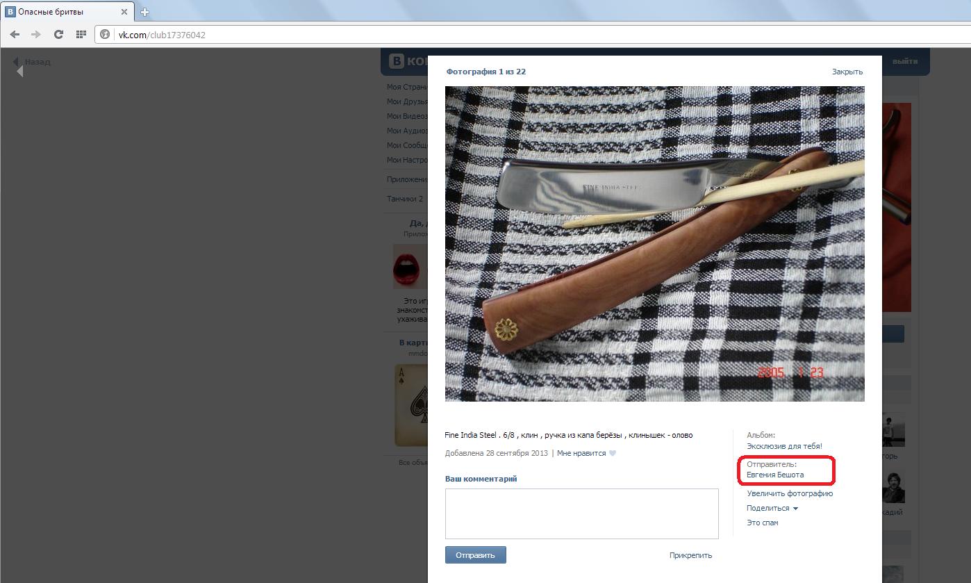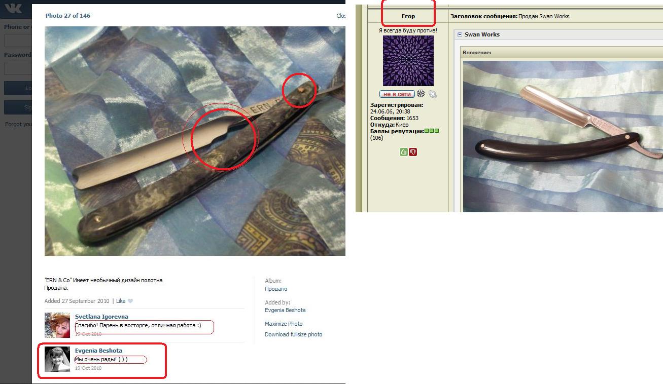 Да он это. Ну заходит через страницу своей (жены, дочери, внучки, продолжите список...) в контакт. Там торгует. Реставрирует бритвы, комментирует грамотно. Фотографирует свои бритвы на фоне гламурных платочков, опять же, из Киева. Посмортите фотки сами.