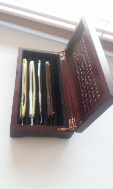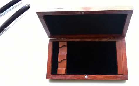 При потере фиксации можно крышку изготовить будет, но это на перспективу. В дереве сквозные отверстия для вентиляции имеются, так что "дышать" футляр будет Seawolk. Бритва тоже хороша, бреет мягко. Спасибо! Re: Футляр для опасной бритвыДобавлю свое чудо ) Заказал шкатулку для ручки, выкинул потроха, отделал черным бархатом. Вышла коробочка на 5 бритв.