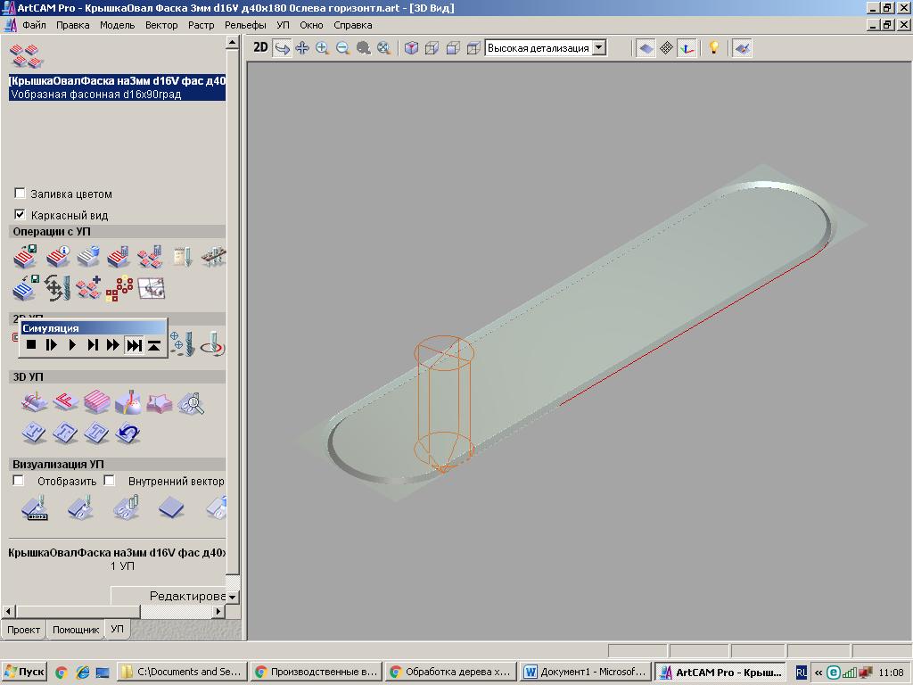 Ну и понятия (АЗ, буки, веди...), без них...: Фреза сверлит вверх/вниз или делает "выборку" материала, если заглубилась в него и идет вращаясь по линии вбок куда ть. Ну и "вектор" - это линия, направление, вдоль которой идет фреза. Если нужно обработать уже поверхность, то она образуется уже 2мя линиями (или более) - скажем круг - один вектор + прямая - второй вектор. Налагаясь/скользя (круг скользит по прямой) друг по другу вектора получают цилиндр/трубу (или овал, если под углом наложение), в данном случае. Если налагаются 2 криволинейных вектора, то получается любая по безумию поверхность, например буквы или ещё какая то хрень, ну то, что нужно, ить. То, что на принтскринах ниже - базовые операции по изготовлению пенала для бритвы...