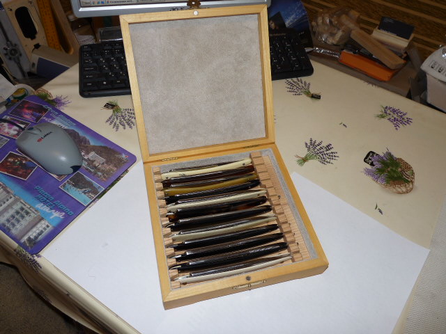 Технологически - сделать ручки из дерева/композита/киринита/элфорина &etc. в цвет кофра (и сам кофр) и их поставить на клинки - нет проблем. Но это тогда будет вариант не усредненный, а типа подарочный, конкретный, причем именно эти бритвы будут "привязаны" именно к этому "гробику"