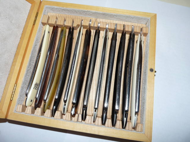 Потому путем прикидок этой пары дюжин бритв к этой "модели" разработал формы выборок (подфрезеровывая чуток там где надо и корректируя проги) и под ручки, и клины, и танги, и высоты под них всех выработал "усредненные формы выборок" под мои 2 дюжины бритовок. Так что эти формы не "просто так" от балды - это усредненные результаты натуральных замеров на осиновой модели будущего футляра. Причем исключены были только 4 бритвы из 22...24штук, по разным причинам (не вписались без визуального изменения формы выборок или больших габаритов).