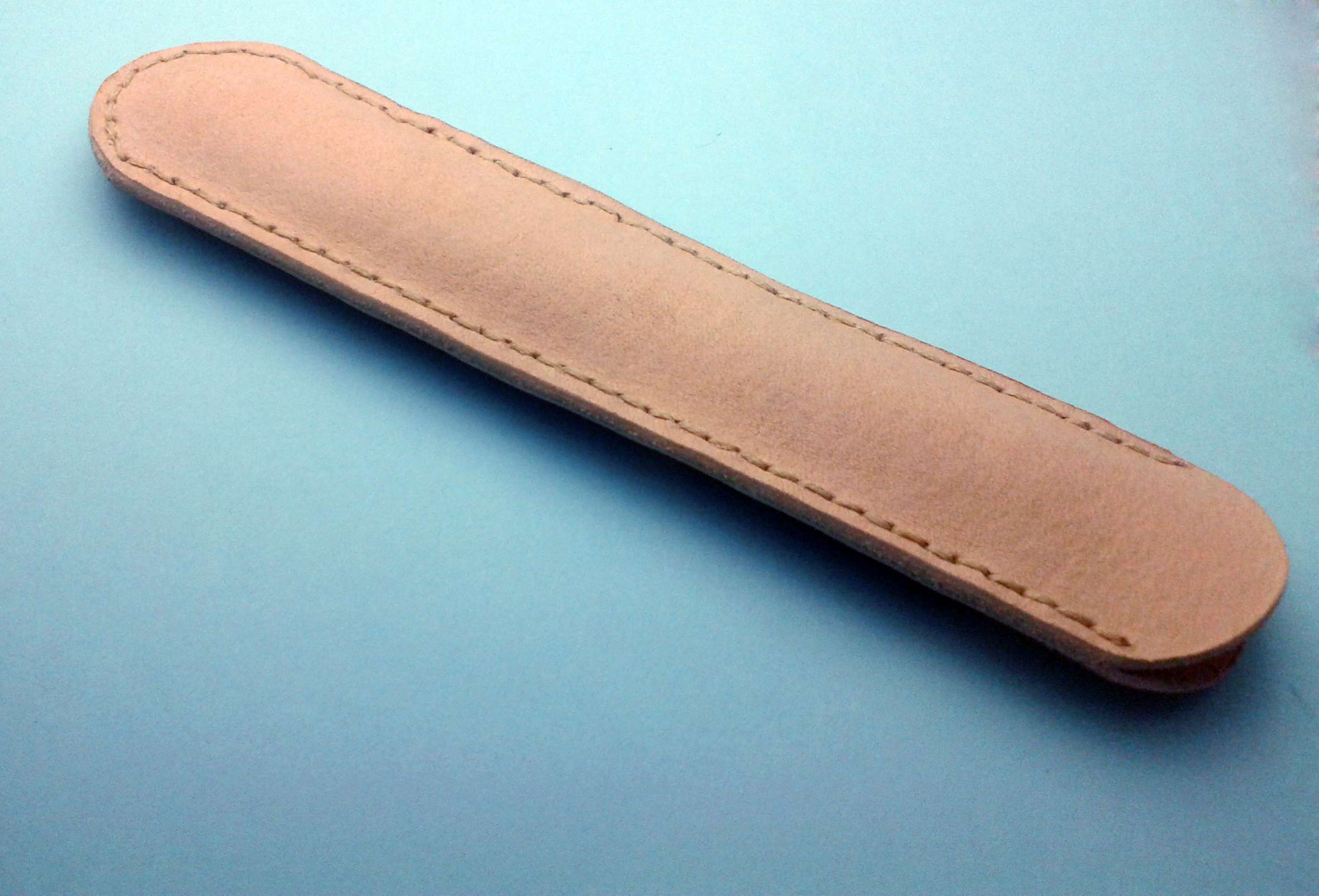Хотя есть одно большое НО - смотря какая кожа, точнее, тип ее выделки. Знаю, что ножны для ножей рекоменуют шить из кожи натурального дубления, потому что некоторые виды кожи химического дубления могут привести к коррозии. На моем первом чехле химическое дубления, но все ок, химия правильная оказалась. А на этом натуральное дубление. Кстати, кожа натурального дубления очень гигроскопична, так что если на бритве случайно будут небольшие остатки влаги - быстро впитается.