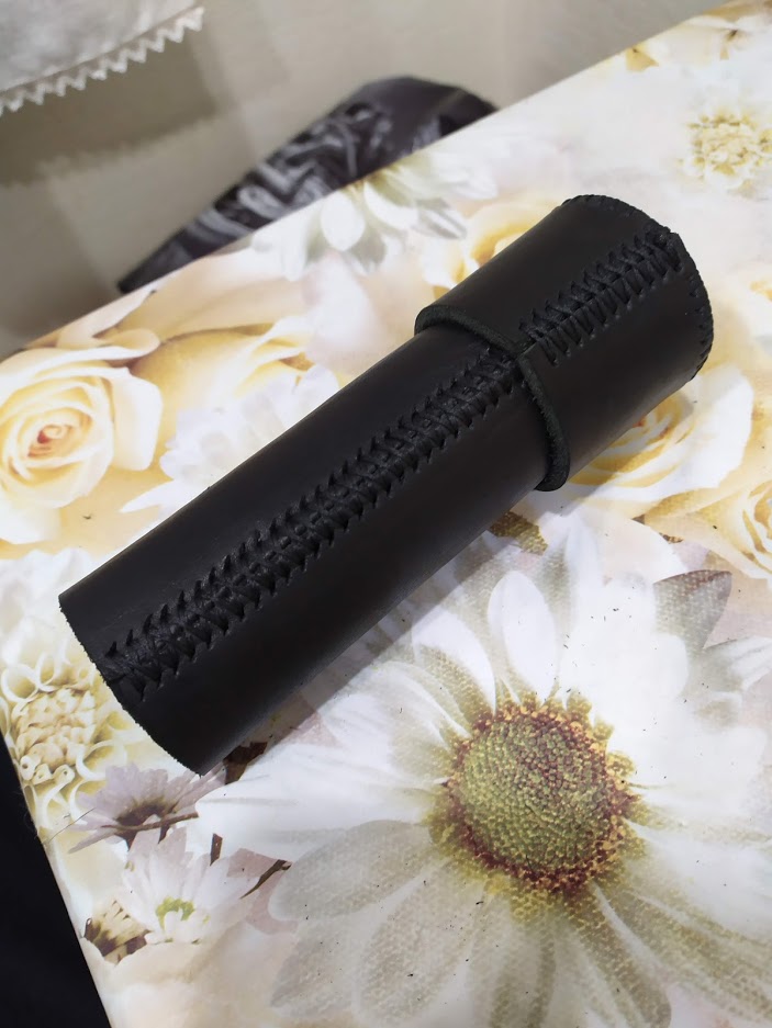 Процесс изготовления изделий околобритвенной тематикиТакой вот футляр для помазка пошил в свободный вечер из чапрака. Толщина около 5мм, нить вощеная 1мм. Дна нет. Помазок загружается ручкой вперед через верх, извлекается выталкиванием через низ. Опробован в поездках, неудобств не выявлено