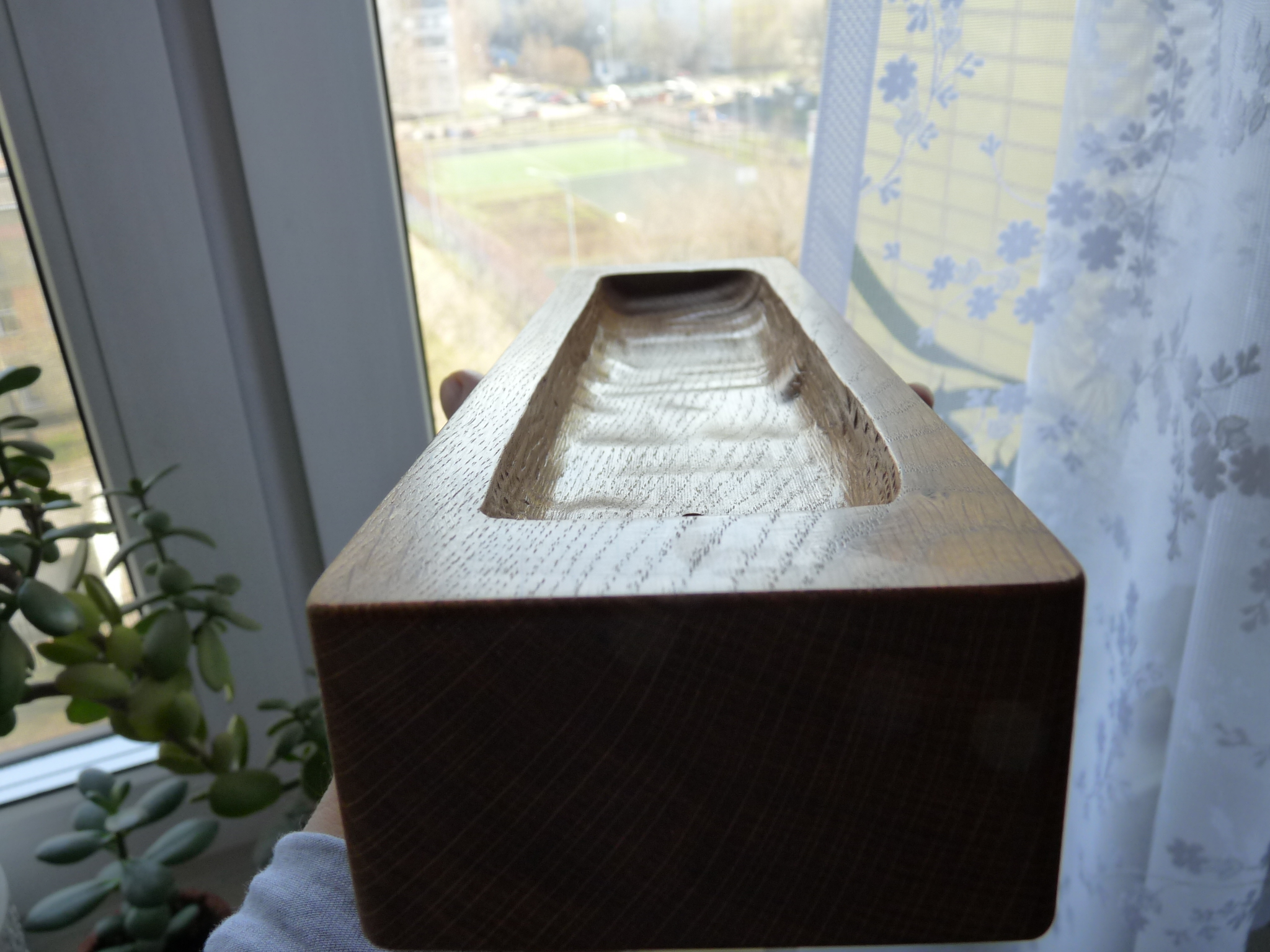 Задача была сделать дно максимально повторяющим контуры дна ЧФ. Хорошо бы для этих целей использовать датчик с 2мя лазерами - лидарами на координатном столе Х и У (которые формируют прогу кривой поверхности, например в Stl), но, пока до них не дозрел финансово, хотя есть варианты... а можно было бы и просто заказать СТЛку... (пример - https://www.youtube.com/watch?v=59chV9YlEqo) или так - https://www.youtube.com/watch?v=jYdAnzbrd0U или так - https://www.youtube.com/watch?v=23XNTRv ... e=emb_logo Заказчик прислал точную модель ЧФ (со слов заказчика), отлитую из чего-то зубного (камень, но мягкий) и покрытую тонкой плёнкой тоже чего-то. Для себя решил попробовать быть "ручным лидаром", то есть нанес сетку с шагом 5/10мм по всей поверхности "камня" и померил толщины во всех точках этой сетки штангелем. Затем внес данные замеров в прогу и вперёд. Надо сказать, что это более тысячи измерений и вычислений, включая все точки. (самоизолировался так, исключительно связался потому) PS отправил заказчику для примерки. После примерки камней, если всё будет хорошо, то делаю 2 короба из сапели - под ЧФ и под Вашитку. Будет гарнитур из 3х предметов. Типа чтоб внуки не выкинули красивую вещь - камни хранить в коробах, а работать на камнях именно на этой подставке. PPS И ЧФ и вашита должны выступать над срезом подставки на 10мм. Размеры этой подставки и 2х коробов для хранения камней будут идентичными - 79х294х42...44мм.