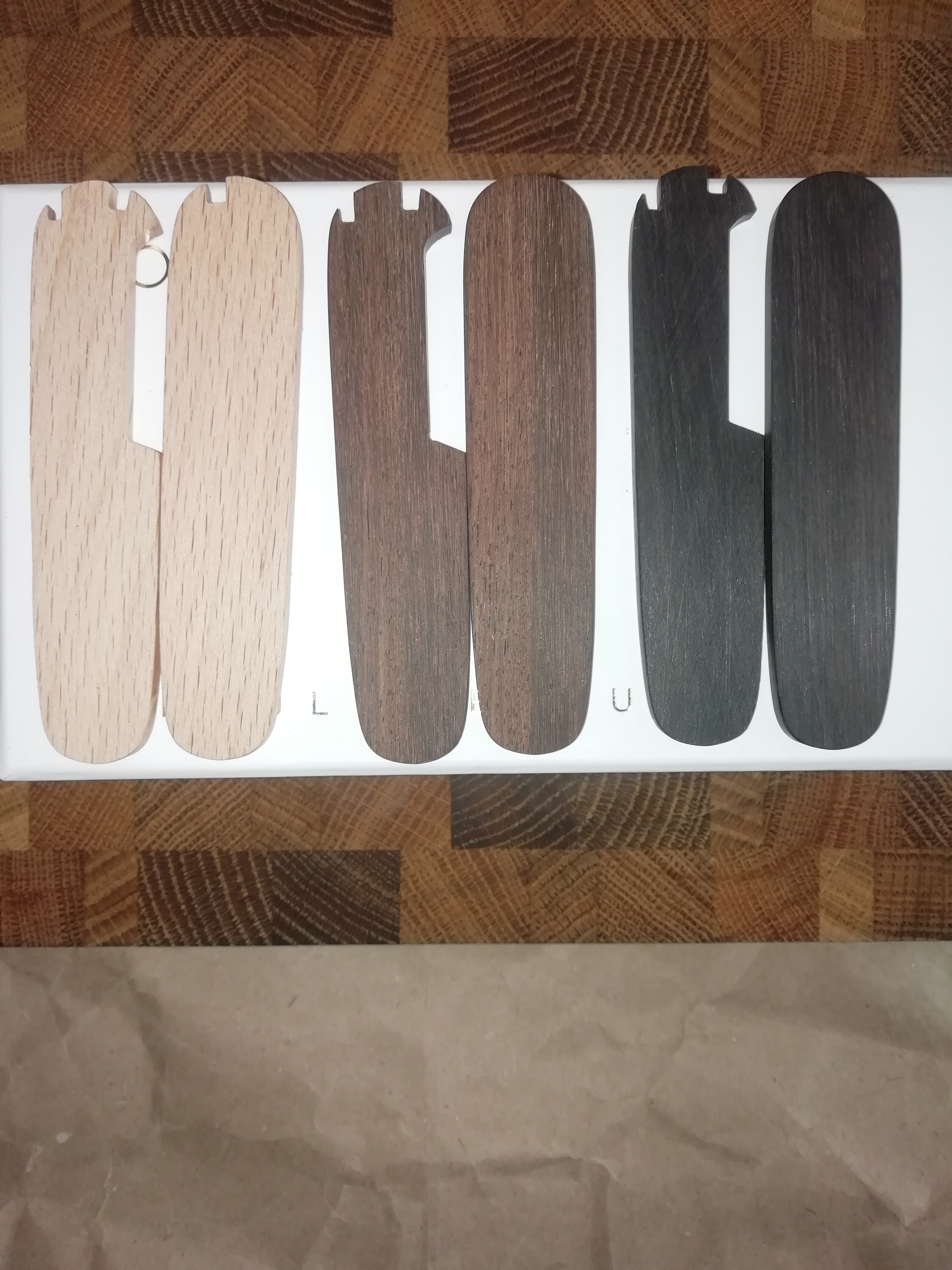 Процесс изготовления изделий околобритвенной тематикиА вот накладочки для Викса-91 (Victorinox 91мм) сделал из экзотических пород деревьев.