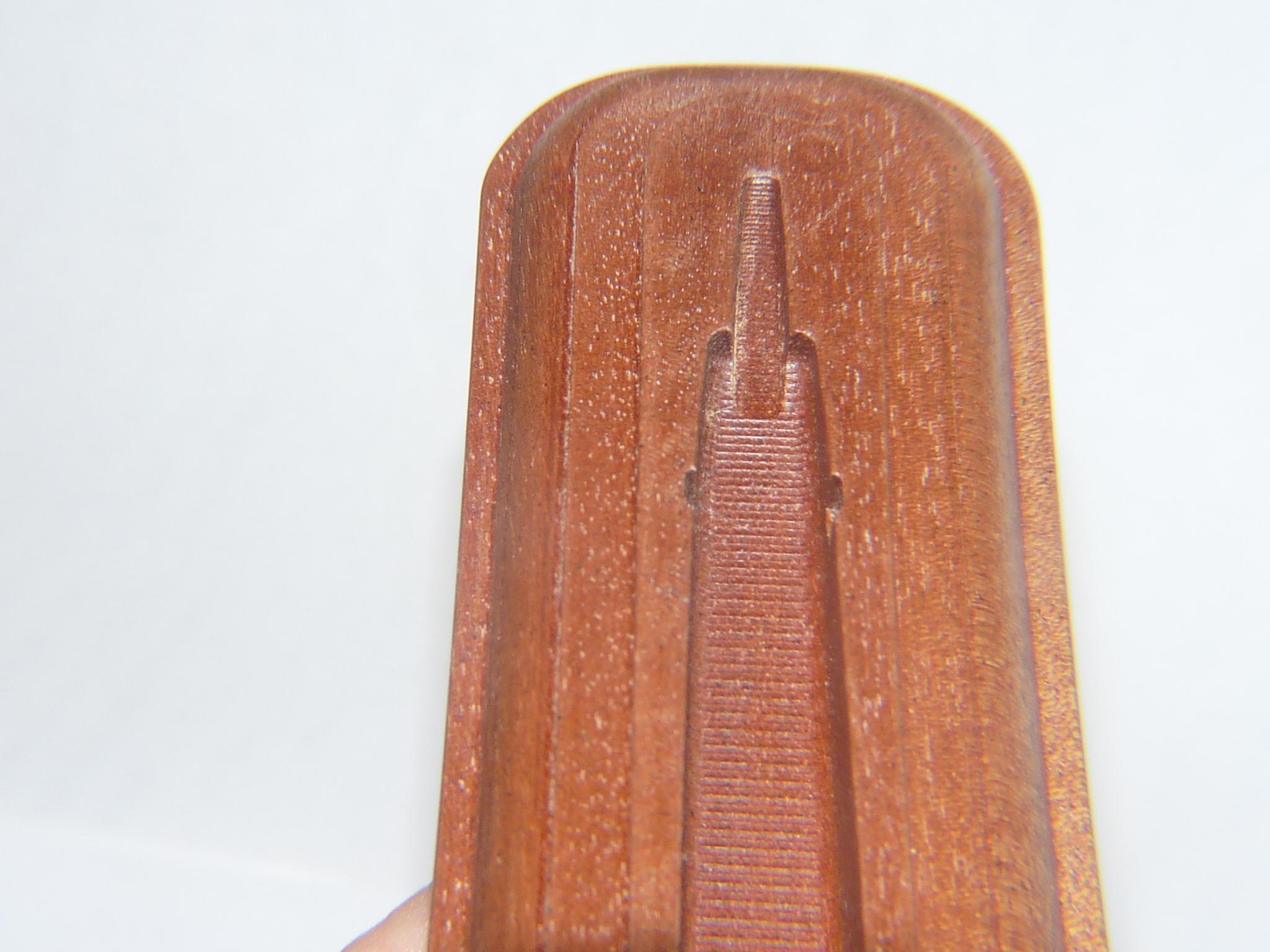 Красное дерево, даниш, затем воск мебельный, полировка. Подставка под конкретную бритву от ГВИКа (ручка из юмы/элфорина - моя, клинок от ГВИКа - спецзаказ). Возможно ещё сделаю для этой подставки колпачек, тоже из красного дерева... PS Фотки делал с линзой 10х, потому есть хорошее увеличение, если рассматривать... Добавлено спустя 8 минут 32 секунды: Последние три фото (вид - подставка снизу - там планирую фетр прилепить ярко-зелёный для контрасту - чтоб на полированном коммодике в спальне стояло, и не царапало полировку) - показал как переливается цвет дерева "золотым на темно-красном" в зависимости от наклона и освещенности.