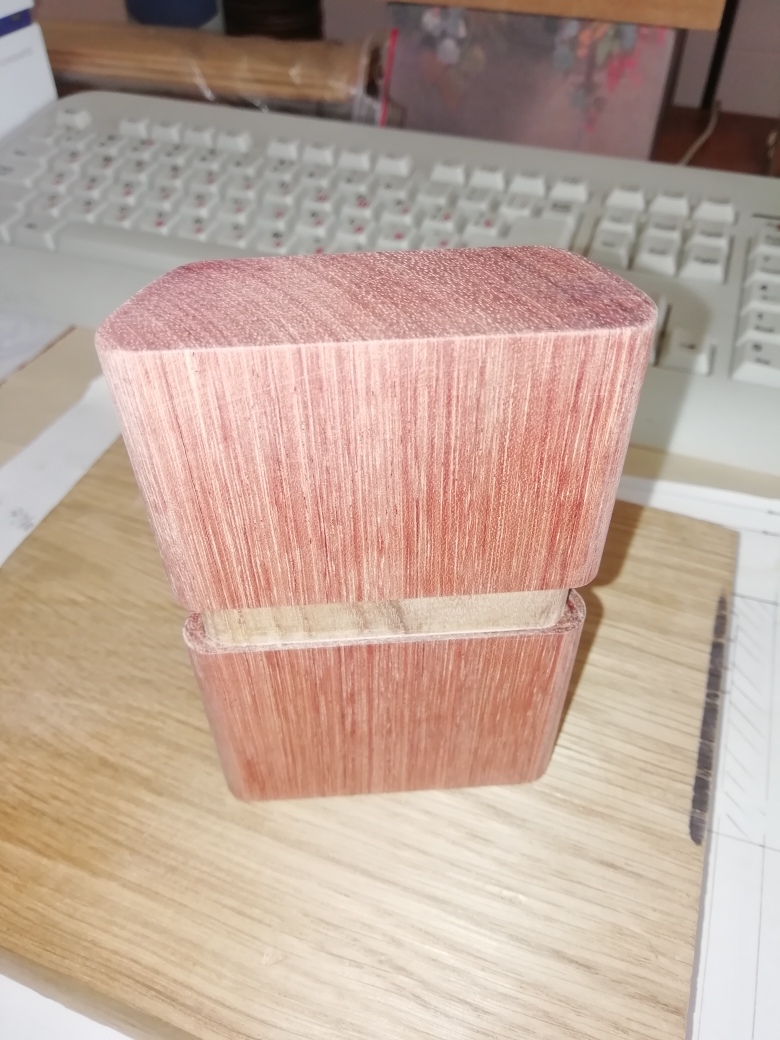 Ну и в продолжении "цыгарэтн бокс" темы (или как написал Virabian6 - "хьюмидоор") - корпус сделал из бубинги (что то гевееобразное) африканское, неплохо обрабатывается при том и не колкое. Пока только корпус. Но мы же нэспишим никуда. Толщина стенки 1.5мм, с торца - 2,8...3,5мм. Общая толщина - до 23мм будет, ширина тут - 68 мм, высота корпуса без вставки - 50мм, со вставкой - 78 мм. Общая высота портсигара будет (тьфу 3 раза) - 95мм. Сига торчит на 10мм над вставкой. Общая толщина стенки - 1+1,5=2,5мм, если проклеить, ну и плюс усиления - торцевые. За корпус я спокоен. А вот крышка будет довольно тонкостенная, надежда на супер дерево токмо.