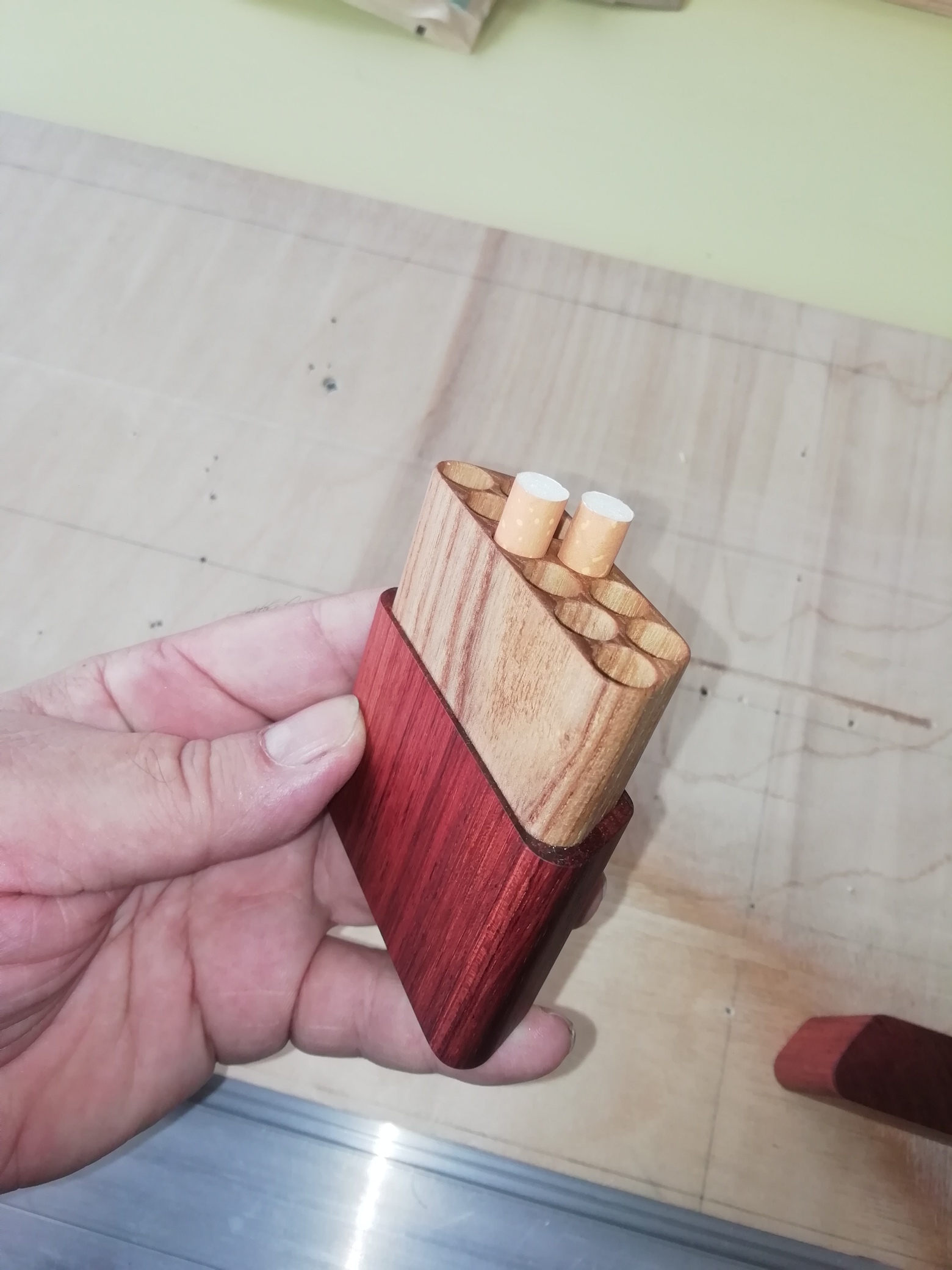 При впихивании (несколько проб), сиг в трубы - всё норм, заодно скрученной в трубочку шкуркой пошоркал ту ступеньку. Тут я думаю - норм. Там у заказчика проблема на работе с разделением сигарет с шефом (курят одно и тоже), кажется, и таким образом , наверное, он хочет забить/обозначить свою или его долю Ну я тут как бэ только исполнитель прихоти. И ну 20, а с "кожурой" будет 22, ить, и ничего - норм - только хочет теперь без магнитиков, как бы +1мм вокруг - на корпус и крышку... заоваленным ромбиком типа пусть будет - "удобнее чтоб держать". Ну вот ясень попробовал на "глубокое бурение" - 1 мм стенки - ясень выдержал без разрушения и отклонений. А вот бубинга... не работал, говорят пластичная, посмотрим, наверное. Обещали подкинуть на след неделе бубину, посмотрим. Если что, дорежу тем же ясенем - хороший для тонкой обработки материал. PS а сколько толщина/ширина/длина обычной пачки?