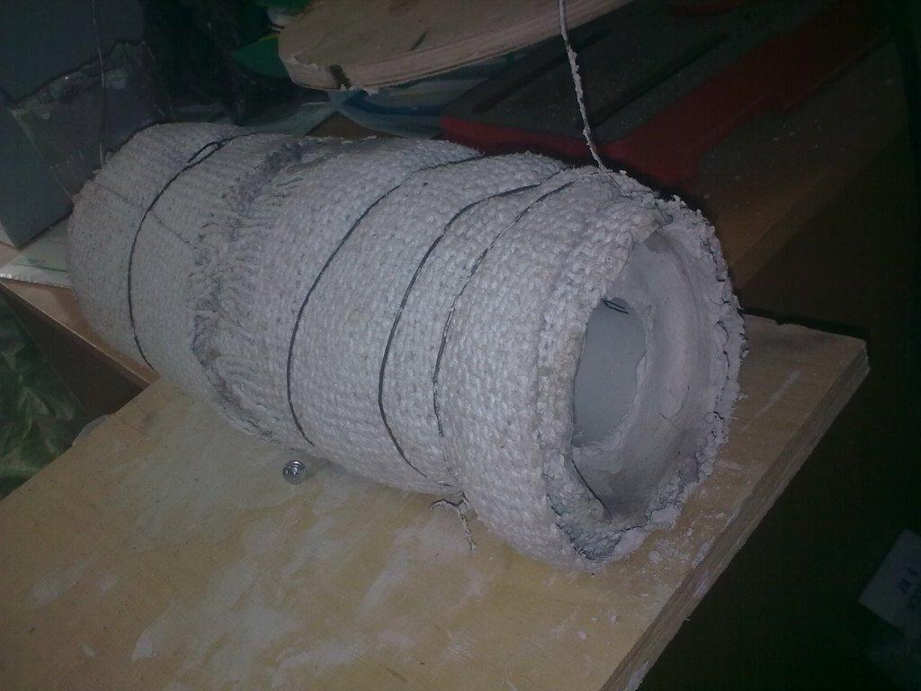 Обмотал асбестовой тканью и минватой, вмонтирвал все в корпус из нержавеющего дымохода. На концы нихромовой проволоки , проходящие через теплоизоляцию, надел форфоровые бусинки-изоляторы.