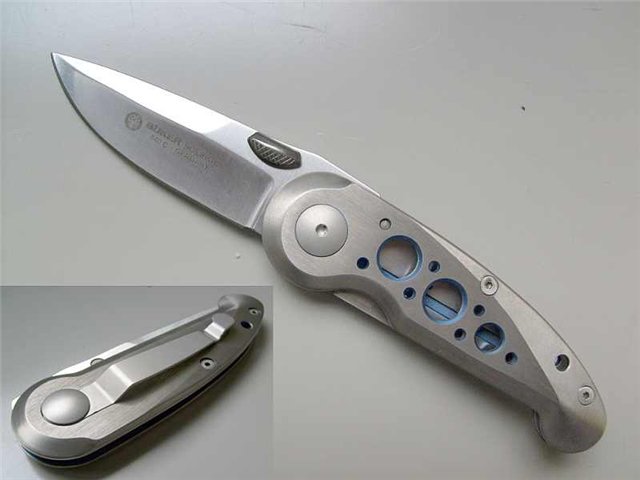 У мну вот такой небольшой режичег .  Титановая хваталка с анодированными углублениями и лезвие из 440с стали в общем сморится он суперски . Открывается очень плавно. В линейны замок вмонтирован подшипник который обеспечивает плавность хода до фиксации . Открывать его можно одной рукой . Кстати такой парадоксальный момент если провести по синим частям мокрой рукой то они приобретают светло фиолетовый оттенок . Такой же оттенок проявляется на морозе . Изделием доволен хотя ни разу не пользовался с тех пор как купил  . Он у меня почти уже 10 лет лежит на полке  . Советую всем кому нужен небольшой складной надёжный ножик . Для грибов и на рыбалке веcчь не заменимая !!!