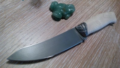 Re: Наши ножиКороче, чесались руки, ну и настал всё-таки тот момент. Сделал. Делал месяц. Кроме ковки - всё моё. Клапан тепловозный в кузне товарищ хороший расковал, у него-же отслесарил уже сам. Долго. У другого товарища в столярке взял берёзовый кап, собрал рукоять, гарда и тыльник - бакелит, сквозной монтаж. Плюс дремель - и знак зодиака прилепил. Мож и не к месту...Год назад подарил Buck (эргохантер адреналин), захотел повторить рекурву. Короче, по мотивам Адреналина. Кончик хотел ниже обуха опустить, не вышло, переделывать не стал. Не ножедел я. Поэтому и кидание тапками пофигу