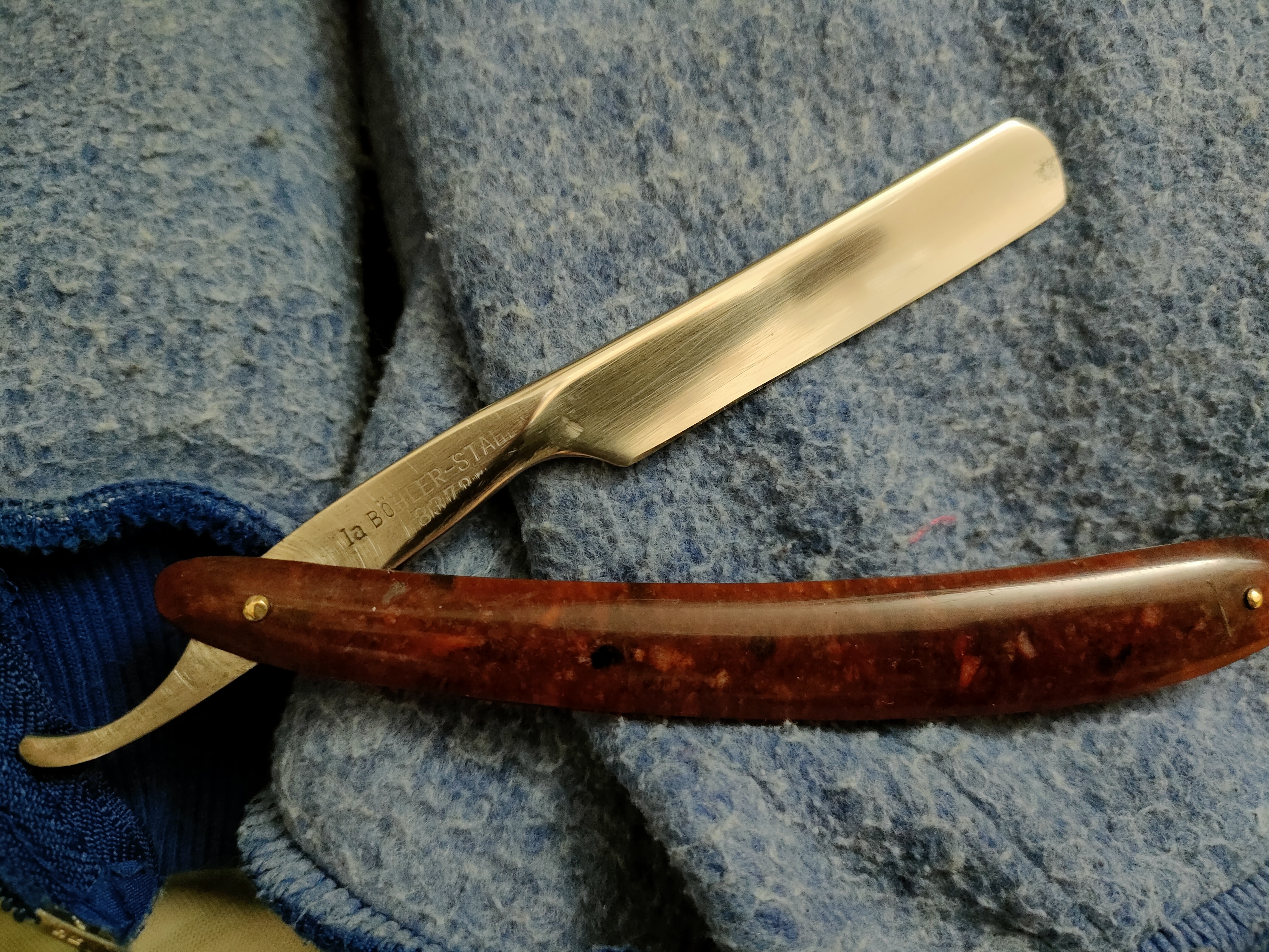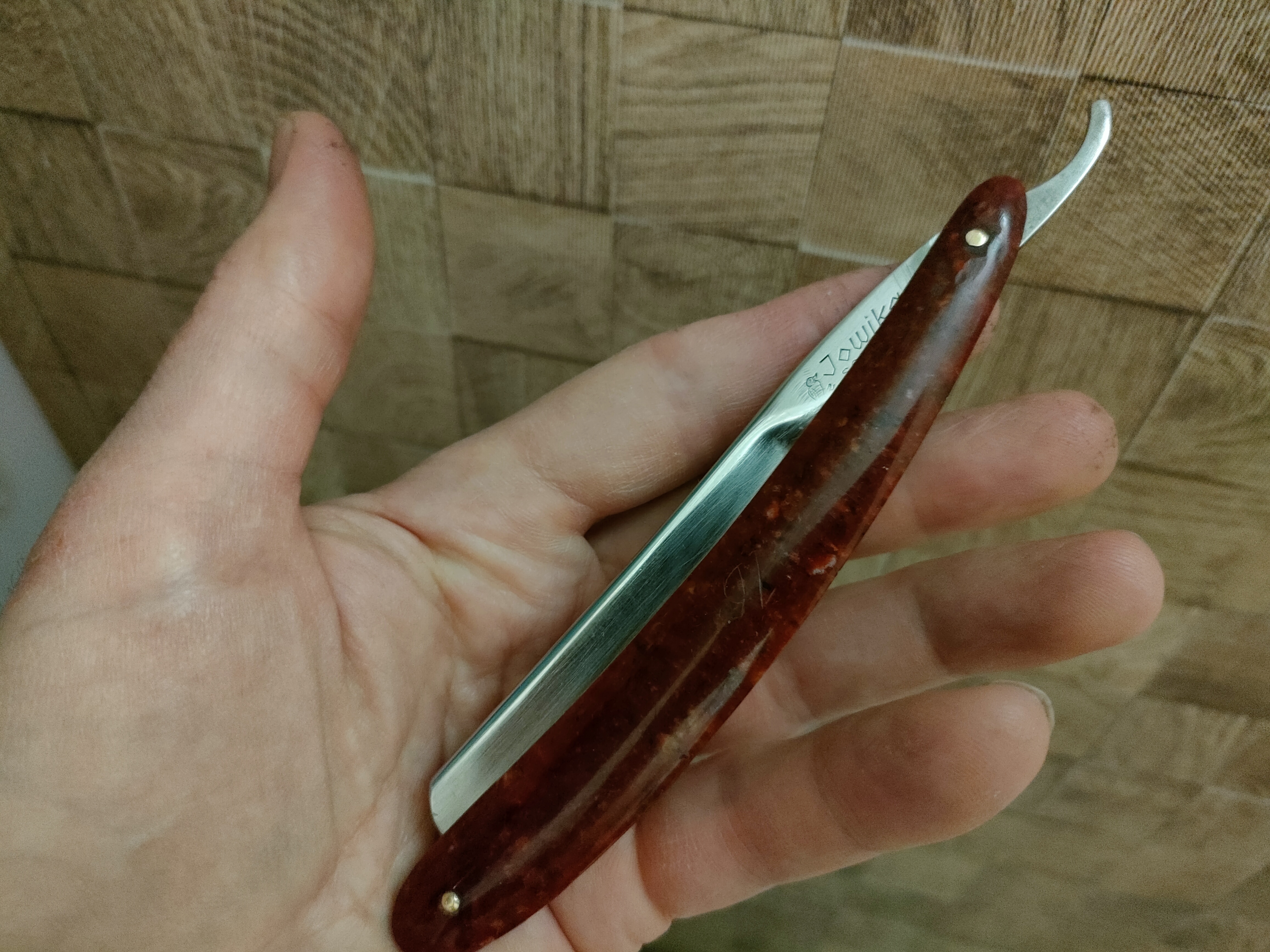Правда пришлось сточить вместе с царапинами оригинальную гравировку, впрочем ее и было почти не видно. И я любитель французской формы бритвы, так что как смог переделал немца во француза. Результат - выглядит веселее, бреет не плохо