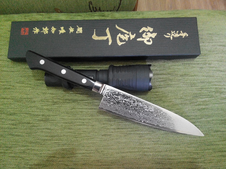 Характеристики следующие: Общая длина: 235 мм Клинок: 135 мм Толщина обуха: 4 мм Ширина клинка: 20 мм Рукоять - рог, набранная кожа. Сталь клинка - углеродистая, около 57 HRC. Несмотря на внешний вид и некоторые особенности, на кухне и в быту оказался очень удобен.