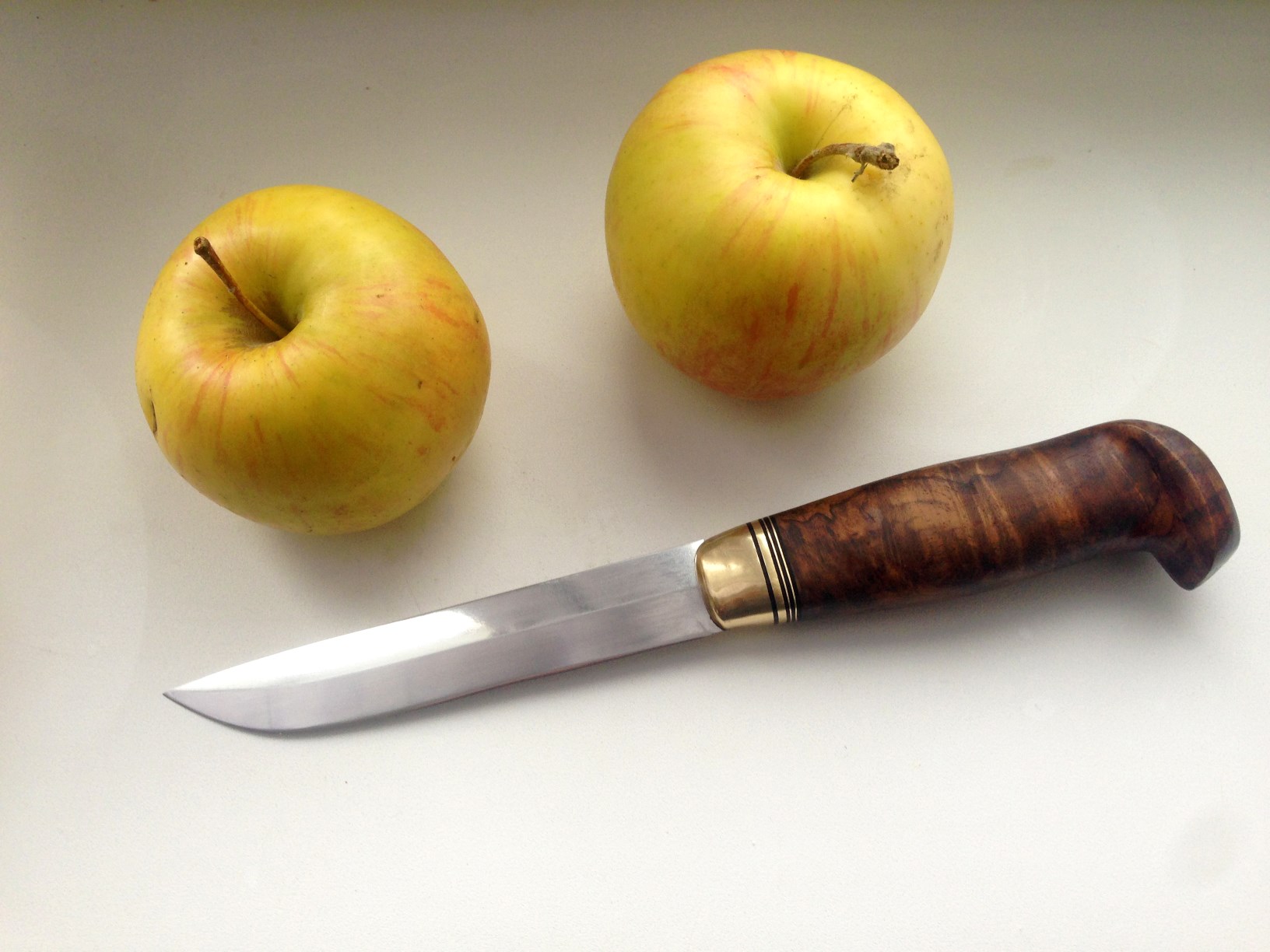Вот такая финочка: лезвие ромб 130 х 21 х 4 мм, рукоять кап горного ореха 120 мм. Монтаж всадной врасклеп. Как обычно - 4 вечера на коленке. Бреет.