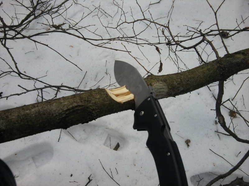 Нож на природу подойдет, я им ветки в диаметре до 5 см с одного магу рубил, клинок сведен был тоньше чем у спайдеровской мили ок. 0,5 мм. Носил на кармане больше года (каждый божий день), мне он не мешал, в руке очень удобный, замок надежный. Приловчившись можно с легкостью открывать нож встряхиванием (клинок по инерции вылетает). Подобный нож заменит легкий топор (томагавк к примеру, их у меня штуки три было), если топорик нести лень, да и мелким топором ветки отрубывать не совсем удобно (тонкие ветки) я имею в виду попадать по этим веткам. Ниже пару фоток, сравнивал его рубящие качества. Замечу альтернативы нормальному среднему топору нет, валить деревья и рубать бревна лучше топором, томагавки и крупные ножи это баловство в таких делах, но если нужно диаметром до 5 см ветки рубить и много я бы взял раджу 2. Раджа 1, который с люминем царапается от "взгляда", как мне писал камрад на ножевом форуме, нож я продал поскольку хотел Cold Steel ESPADA (думал им колоть удобнее), но там люминий, а он царапается, сейчас снова на раджу 2 смотрю, тем более на него новую сталь компания ставит. Для хоз. целей лучше опинели, бак 110, бак авид, виксы (дешево и особо не жалко) все остальное это чисто для души и понтов.