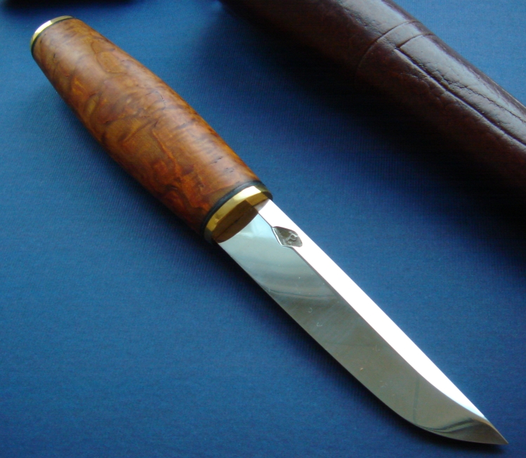 Это по сути финка. Купил за копейки клиночек из М-390 в авторской термичке, ничего лучше не придумал. Вот кстати еще одна финочка. Pekka Tuominen, 100 mm, ромбик. Карелка, льнянка, сквозной монтаж, расклеп в тыльнике. Re: Наши ножитомми единственные из всех финок нравятся ... но кожа на проставки это не серьезно , портит очень не плохой ножик , тем более если больстер подогнали , то там проблем не должно было быть. Или показалось и то не кожа ?