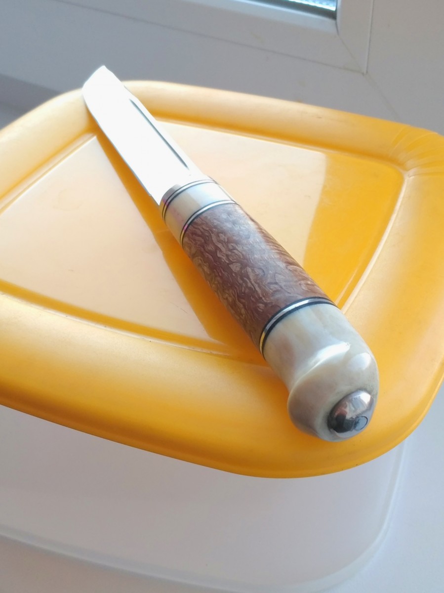 Re: Наши ножиТакое ощущение что кто то взял лезвие от кухонного ножа и сделал пчак. Цена намекает что время изготовления конец 80-х, клеймо не знакомое совершенно