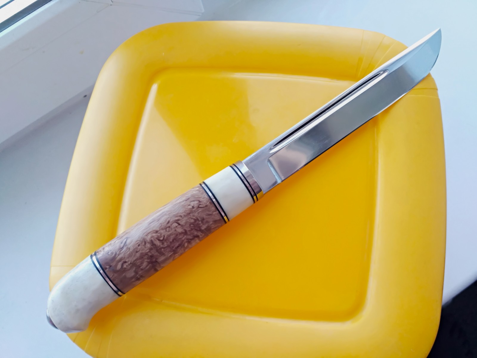 В общем похож на чустовские с клинком типа тугри , но клеймо явно заводское и очень отличается от тамги мастера или надписи которые чустовский завод делал , да и клинок сам коротковат, без дола традиционного Но сама ручка и гульбанд - один к одному как у чустовских перед распадом Союза так что или это какая то из малосерийных моделей , или переделка мастером который очень хорошо представляет как оно должно выглядеть из подручных материалов (сломанного кухонника например) Re: Наши ножиОригинал 100%. Встречал не раз такие в сети, да и у меня их пара - одинаковые. Даже фото бумажной бирки попадалась в инете - сразу не скачал - позже не нашёл. Знатоки говорят - Чуст.