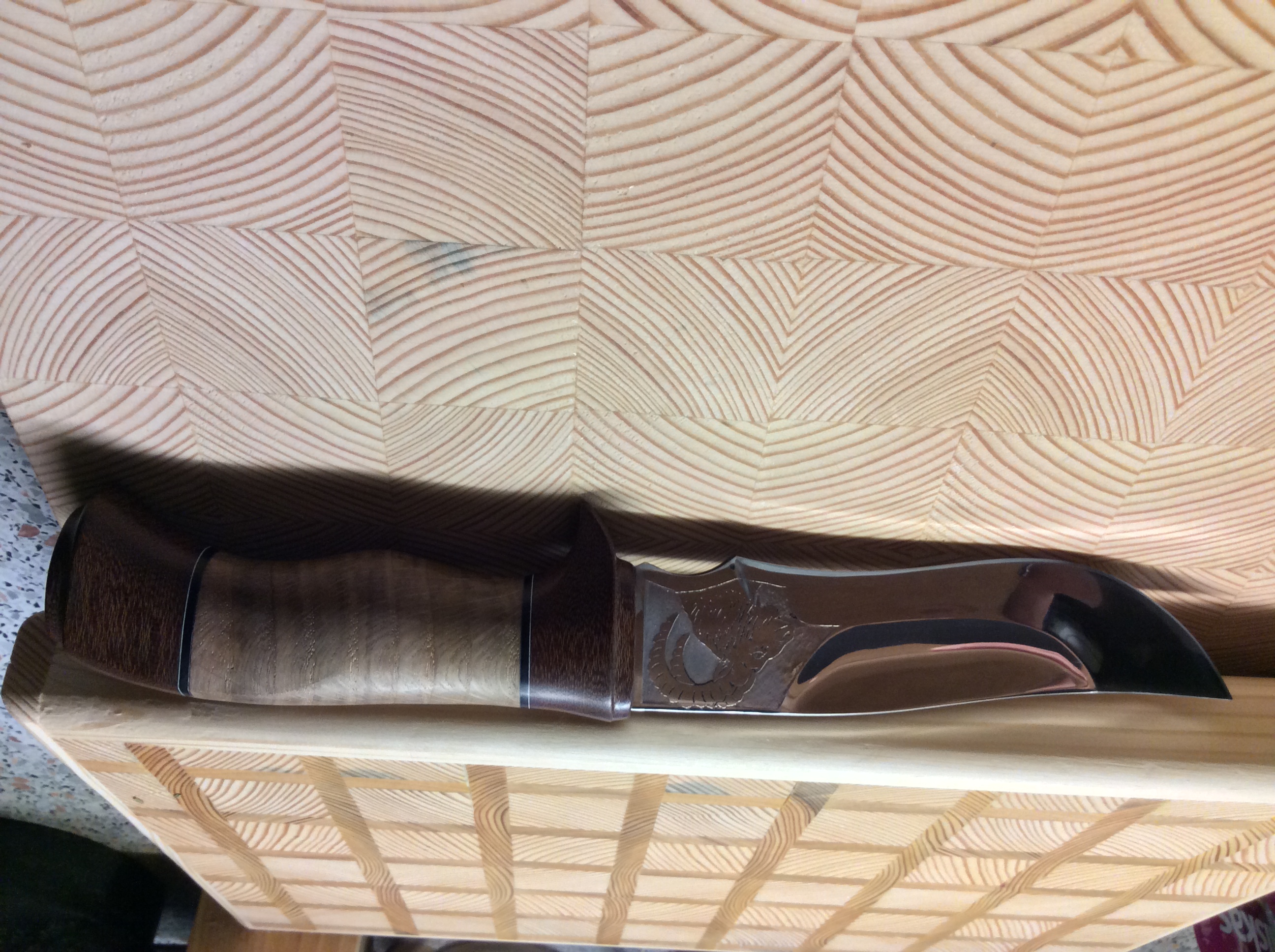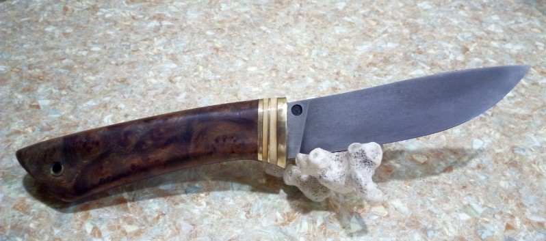 Re: Наши ножиКороче, чесались руки, ну и настал всё-таки тот момент. Сделал. Делал месяц. Кроме ковки - всё моё. Клапан тепловозный в кузне товарищ хороший расковал, у него-же отслесарил уже сам. Долго. У другого товарища в столярке взял берёзовый кап, собрал рукоять, гарда и тыльник - бакелит, сквозной монтаж. Плюс дремель - и знак зодиака прилепил. Мож и не к месту...Год назад подарил Buck (эргохантер адреналин), захотел повторить рекурву. Короче, по мотивам Адреналина. Кончик хотел ниже обуха опустить, не вышло, переделывать не стал. Не ножедел я. Поэтому и кидание тапками пофигу