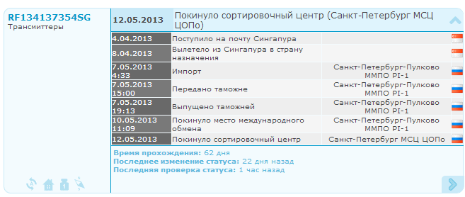 На московской сортировке трэкнулась моя посылка. Итого 72 дня уже: 4 дня из Сингапура 68 дней по России (из них из Питера в Москву 31 день) Маразм крепчал! Но хоть не сгорела и то хлеб... Spoiler Show RF134137354SG Трансмиттеры 4.04.2013 Поступило на почту Сингапура 8.04.2013 Вылетело из Сингапура в страну назначения 7.05.2013 4:33 Импорт Санкт-Петербург-Пулково ММПО PI-1 7.05.2013 15:00 Передано таможне Санкт-Петербург-Пулково ММПО PI-1 7.05.2013 19:13 Выпущено таможней Санкт-Петербург-Пулково ММПО PI-1 10.05.2013 11:09 Покинуло место международного обмена Санкт-Петербург-Пулково ММПО PI-1 12.05.2013 Покинуло сортировочный центр Санкт-Петербург МСЦ ЦОПо 13.06.2013 22:18 Сортировка Москва PCI-2 Время прохождения: 72 дня Ремонт опасных бритв, звонить с 11-00 до 23-00, +79267729357, (viber, whats app, telegram, VK), спросить Олега.