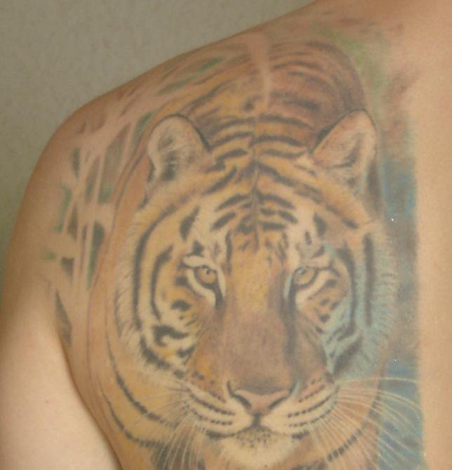 Не нравятся портачки с цветом. Особенно когда фон зеленый.. Такое ощущение, что нехватает окровавленного бинта поверх. Или кольщики неграмотные....