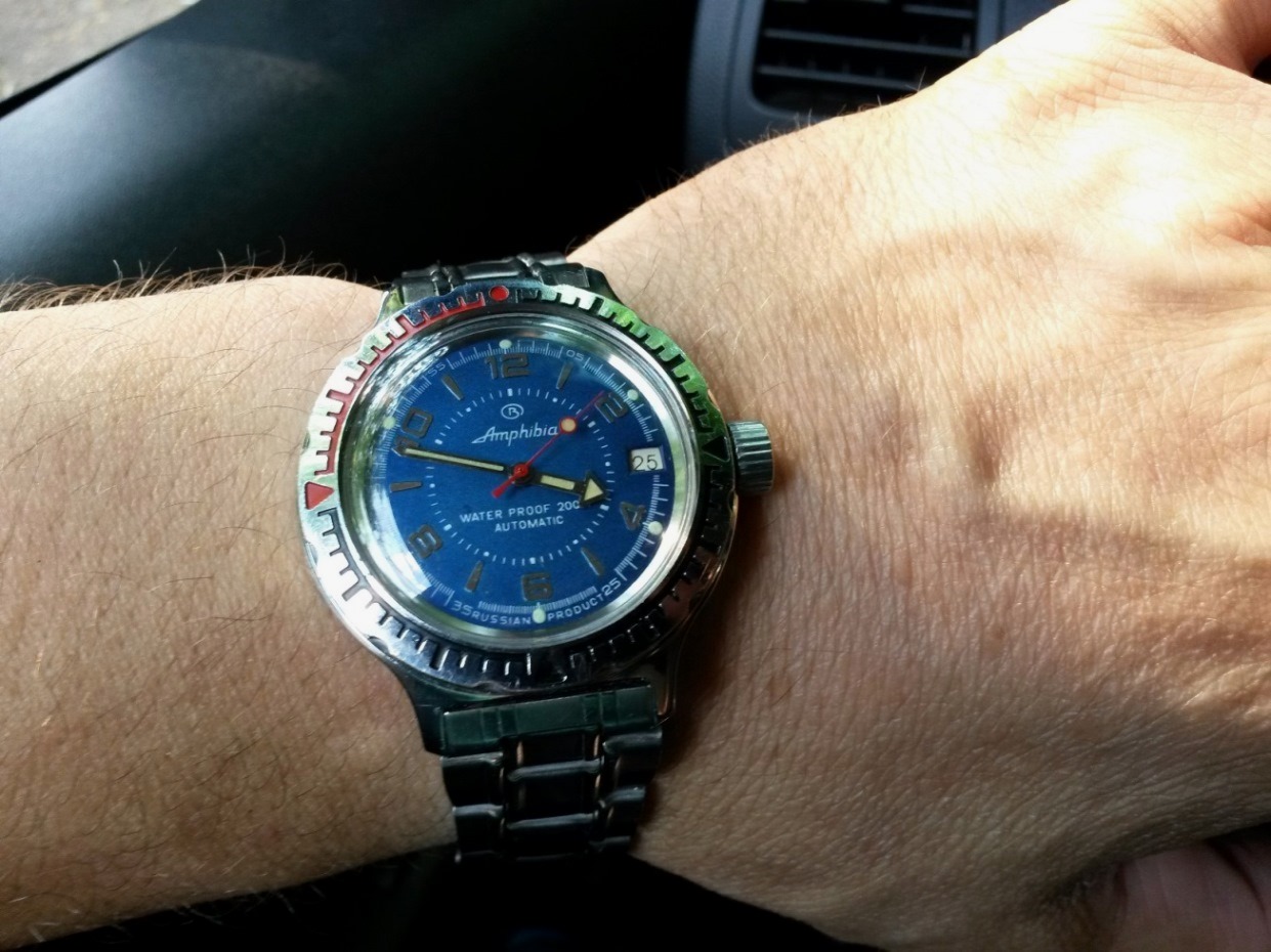 Re: Наши часыСовременная Амфибия с автоподзаводом. Ход точный, дизайн нравится, вот только браслет китайский, но родной, заводской. Дожились, уже браслеты у Китая завод заказывает.