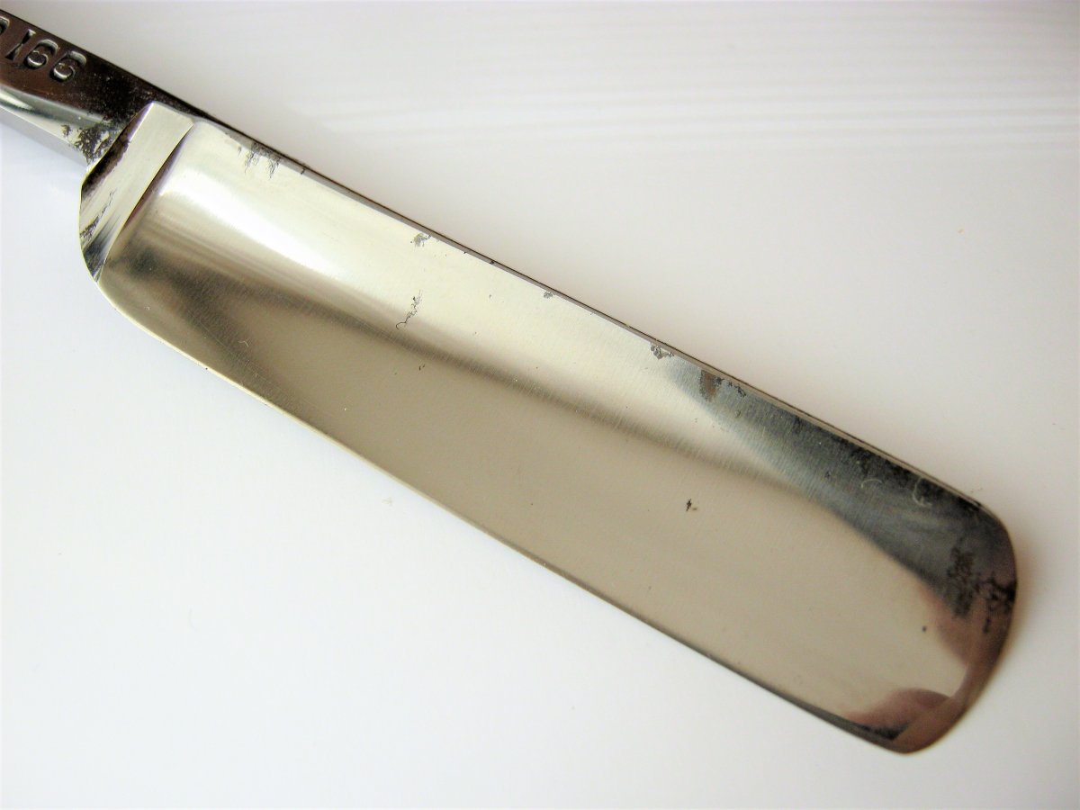 А состояние вполне приемлемое. Спина целая - заточить можно без труда. Почистить слегка. Сильно драить и полировать не стоит - американская сталь и так так себе. Если долго чистить-полировать, то есть риск, что лезвие треснет или отколется потом, если даже слегка при бритье задеть что-нидь твёрдое (раковину или кран). А так - нормалёк. Хорошая винтажная бритва вроде с виду. Для начинающего - самое то. Все будут одинаковы в гробу.