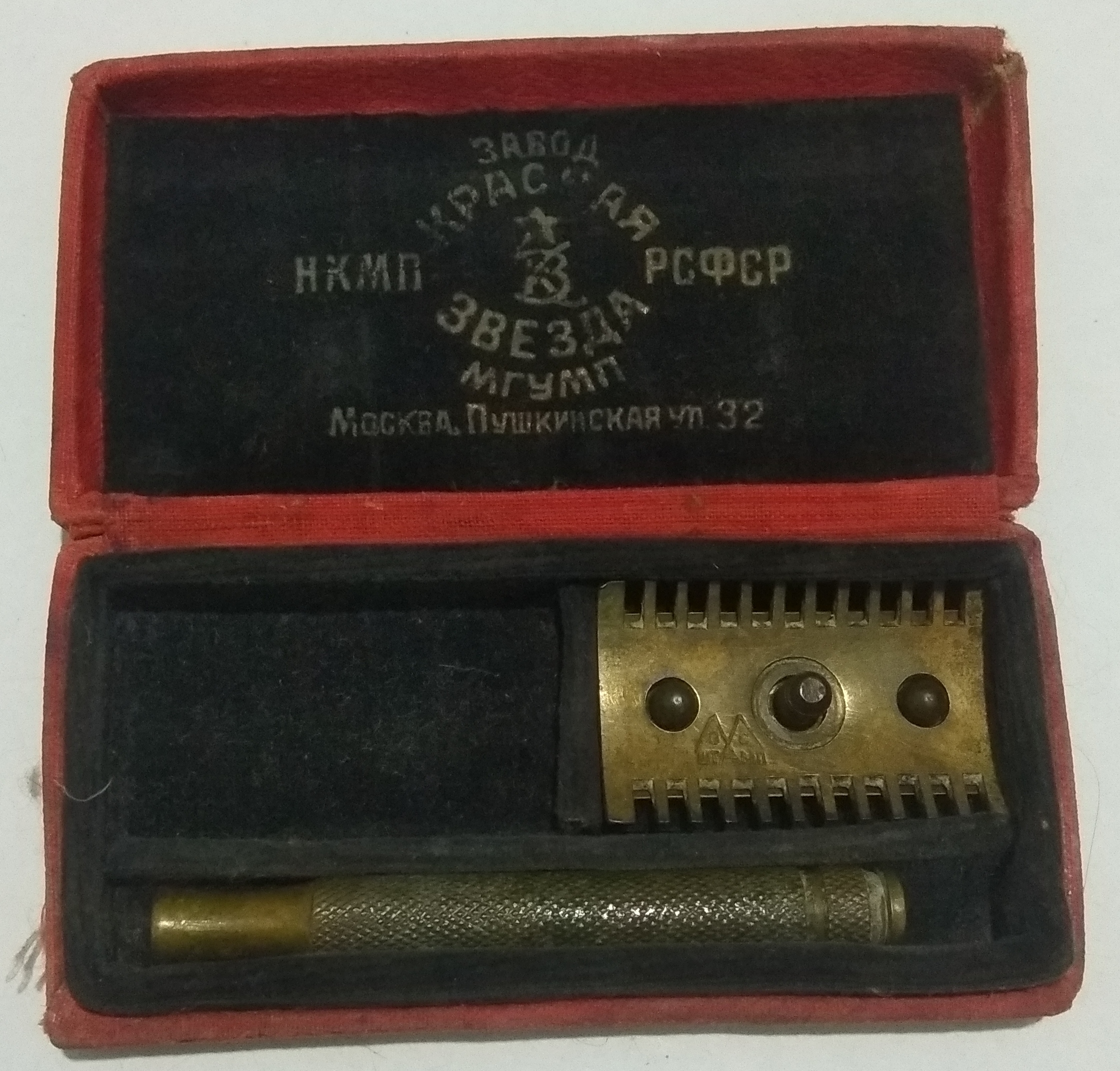 Коробочка от Красной Звезды, а сама бритва = Мосштамп. Формально это один и тот же завод, но бритва выпущена до лета 38 года, а коробочка после. Что уменьшает ценность комплекта.