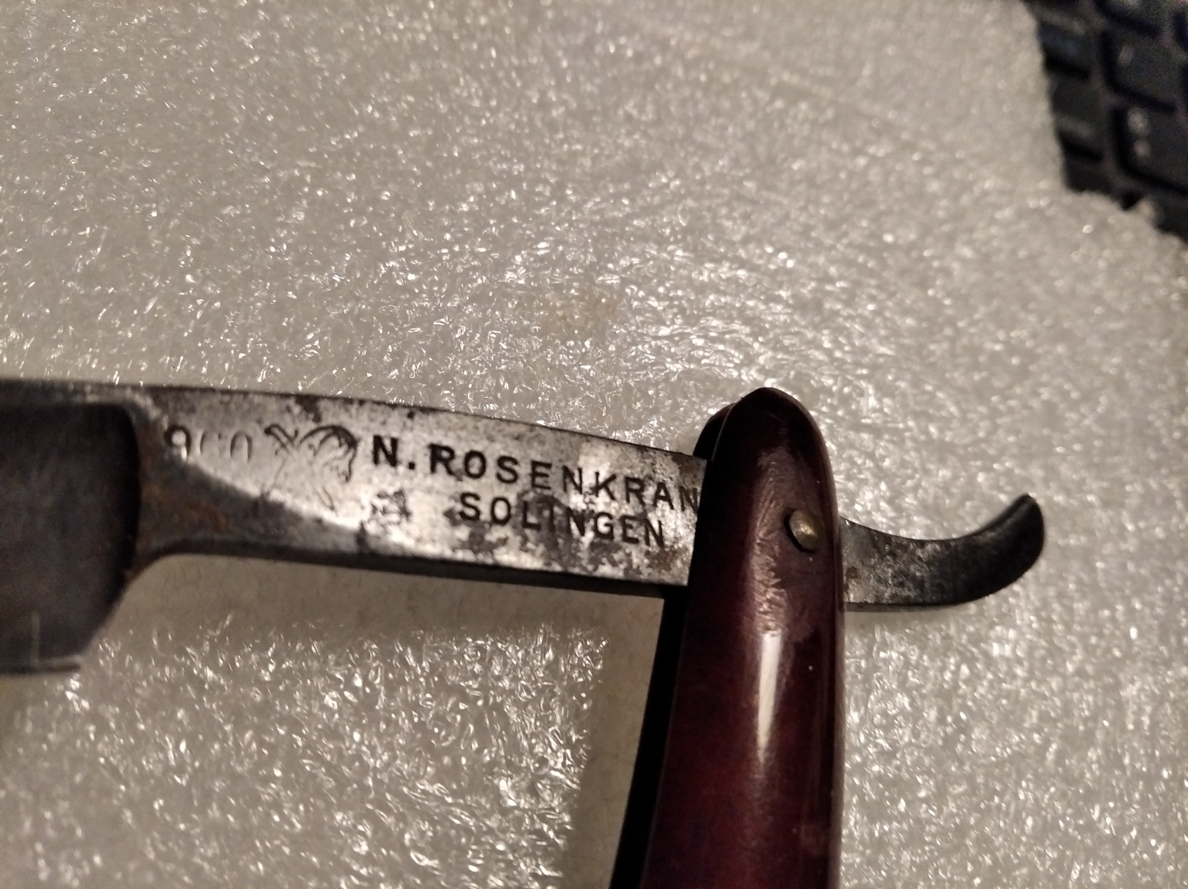 ОценкаДобрый вечер, Уважаемые Знатоки. Разбирая вещи отца, нашёл бритву. На бритве есть следующие надписи: SOLINGEN, N.ROSENKRANT(Z)-возможно последняя буква ушла под ручку). Выбит № 960 и клеймо неразборчивое- похоже на "рыбу-кит" пронзённое мечом. На лезвии травлёный узор- посередине корона, по краям короны надпись SILBER.....STAHL. Перерыл интернет, такого производителя в списке золингезских мастеров такого не нашёл. Клейма такого тоже не видел. Уважаемые комрады, помогите пожалуйста узнать информацию, что за мастер, когда примерно изготовлена?