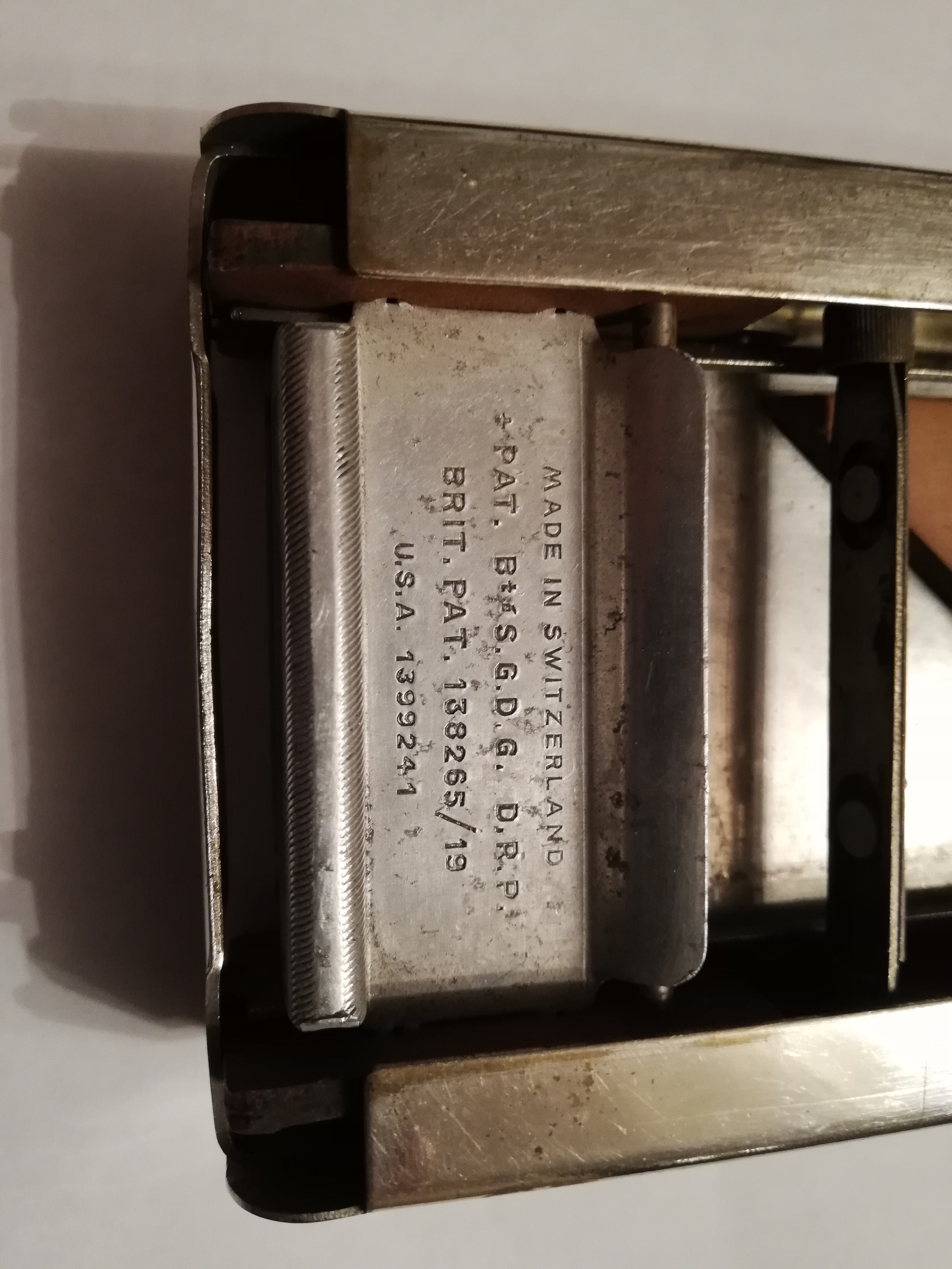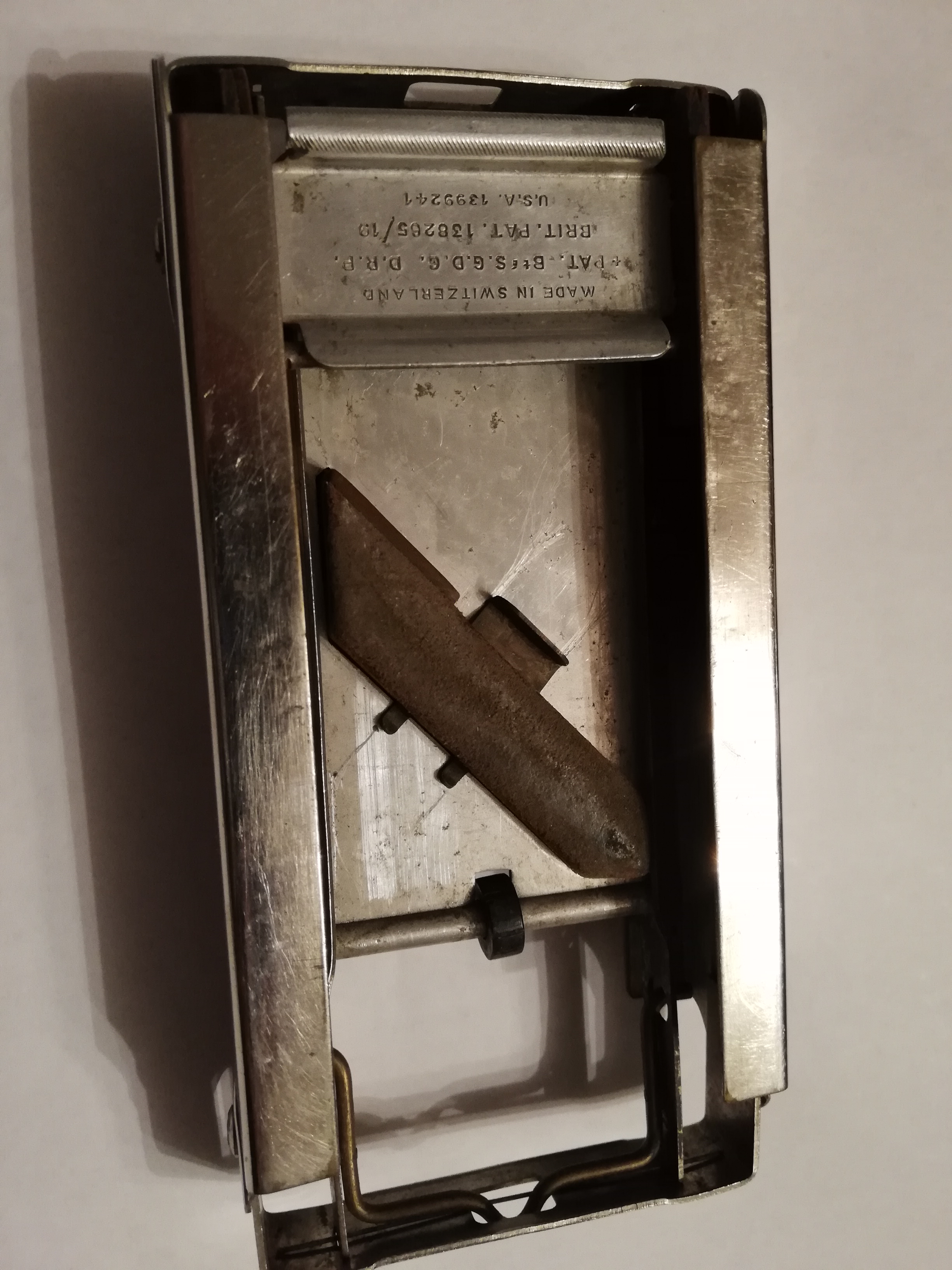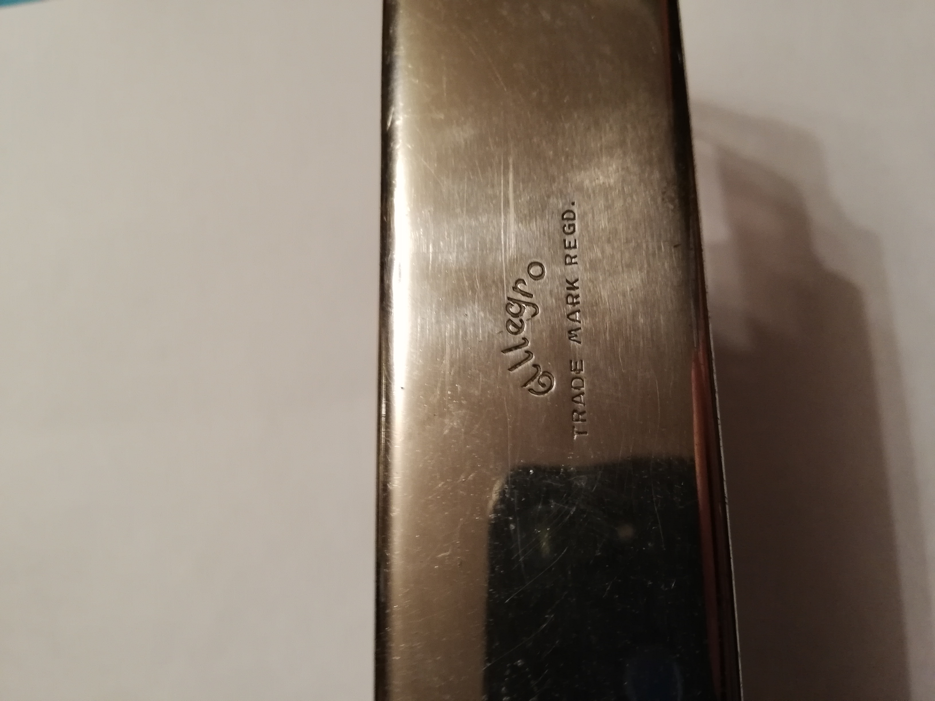 ОценкаБритва-то хорошая, но форма заметно испорчена: ширина полотна у пятки больше, чем у носика; закругление неровное. Видимо, использовалась не по назначению -- резали линолеум, вскрывали коробки... Для придания товарного вида требуются реставрационные работы.