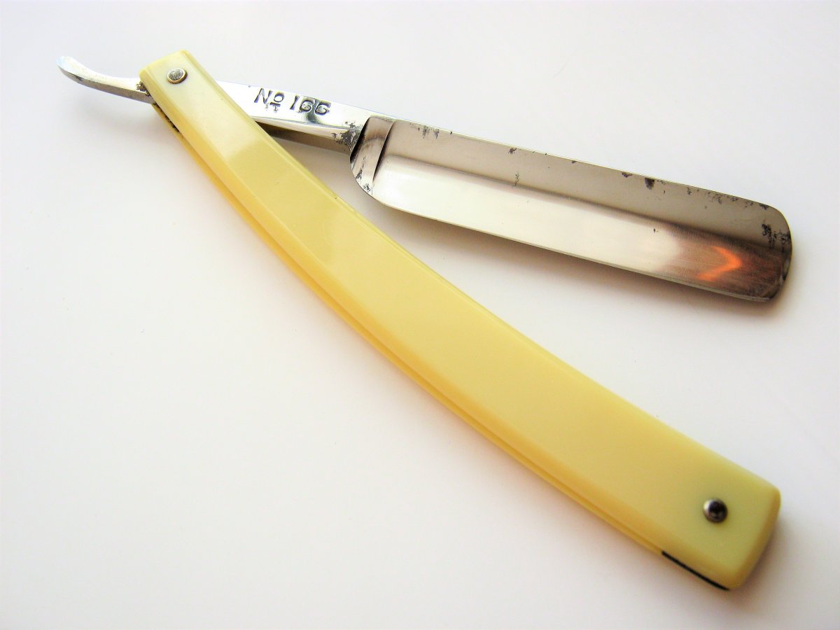 А состояние вполне приемлемое. Спина целая - заточить можно без труда. Почистить слегка. Сильно драить и полировать не стоит - американская сталь и так так себе. Если долго чистить-полировать, то есть риск, что лезвие треснет или отколется потом, если даже слегка при бритье задеть что-нидь твёрдое (раковину или кран). А так - нормалёк. Хорошая винтажная бритва вроде с виду. Для начинающего - самое то. Все будут одинаковы в гробу.