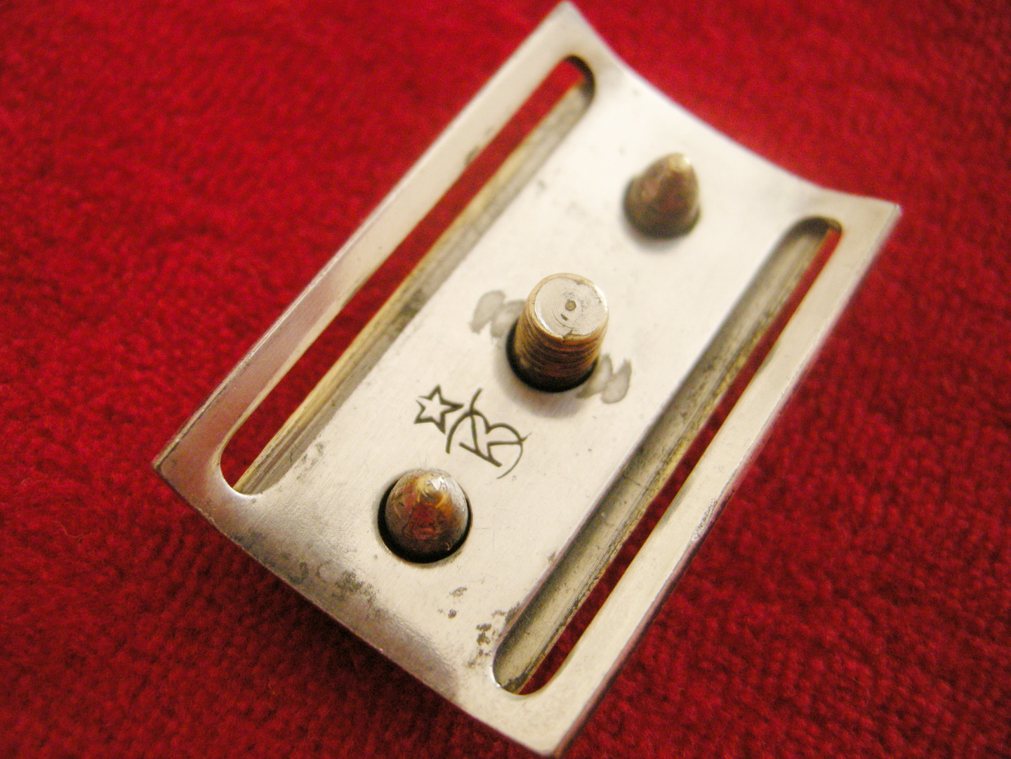 Re: Станки производства СССР и постсоветского пространства."Красная звезда" выпуск 1938-1946 год (вид клейма) - первая советская модель с закрытой гребенкой, латунь с посеребрением. Именно такой станок на знаменитом фото Михаила Славина 1943 года. Футляр неродной от более поздней модели 50х годов