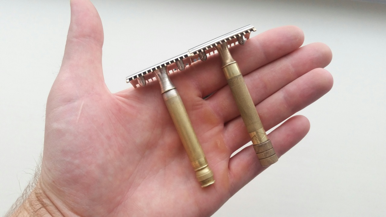 В коробочках лежало много старых лезвий: Балтика, Топаз, Джиллетт, Матадор, еще что то из иностранщины. В желтых уже конвертах, прямо с тех времен. Видно, что станок когда то давно долго пользовали, при этом бережно. Он пришел в исходном виде, но каких то белых налетов на нем не было, все промывалось владельцем и протиралось. А не как иногда раньше делали - побрился, ничего не промыл, бросил прямо так с лезвием. В итоге внутри все заржавело и залипло (особенно жутко это смотрится с бабочками). Застежка коробочки была лопнутая, пришлось удалить ее, оставил только клепку с фирменным лого. В родном сундучке выглядит очень эстетично. Станок собирается без проблем, трехсоставной - ручка, нижняя и веhхняя плита, резьба крутится хоть и не идеально плотно, но зажимает отлично. Вот рядом с моим Woolco Extra. У Воолко длина ручки больше (80 мм против 75), больше вес (55 против 49). Из-за этого в моей руке он сидит получше, так же накатка у него позлее. Но и Джиллетт в руке сидит неплохо, баланс 2 см от головы. Сравнивал геометрию голов, вроде похоже очень, но не идентично, есть какие то небольшие отличия (У Джиллетт голова чуть длиннее, а верхняя плита потоньше). Лезвие на руке чувствуется чуть сильнее у Воолко, оно не так плотно лежит на гребенке. На нижней плите снизу есть фирменное клеймо в ромбе с надписью "Known the world other". А сверху выбит номер D174559. Увы, не знаю, как читается. На верхней плите обозначений нет. Ставил Вилкинсон Сворд и Дерби Экстра, с установкой никаких проблем, современные лезвия ставятся четко, надо только чуть подкорректировать лезвие за уши, тогда получаем идеальный вылет с двух сторон. Геометрия головы на отлично, лезвие ложится без искажений линии кромки, что часто бывает у старых бритв. Бреет примерно одинаково - довольно легко и безопасно, можно махать. По чистоте хуже, чем Воолко, при этом, я бы не сказал, что бреет мягко. Станок требователен к определенному углу, если он чуть отклоняется, то после прохода остаются бороздки из пены или лезвие ощущается как скребок. Выбриться чиcто можно, но на втором проходе приходится в сложных местах дошкрябываться, что не приятно. Воолко в этом плане мне лучше, его удалось раскусить сразу, бреет он чище и понятнее. В общем, пока не раскусил станок, надо пробовать с разными лезвиями, подобрать. А пока отправляется в коллекцию, все таки вещица на вид довольно приятная.
