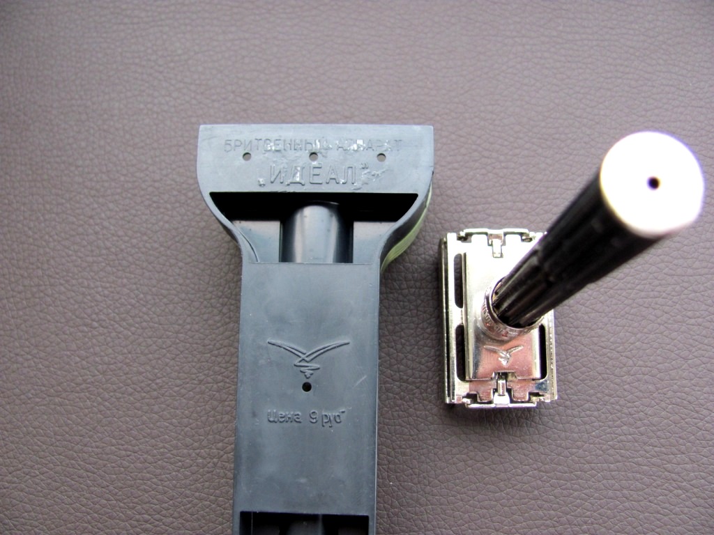 бритвенный аппарат "ИДЕАЛ" , цена 9 грн, в те времена сумма приличная. Футляр как ни странно очень практичный для командировок или отпуска. станок "Идеал" Show Re: Станки производства СССР и постсоветского пространства.У меня вот такой есть. Очень популярный в своё время. Пластмассовая вставка в коробочке потерялась сделал ей замену. Бреет очень зачётно, угол атаки в станке удачный, нет люфтов , всё подогнано, сколько уже ему лет, а в хорошей форме. Только верхняя часть станка у меня вызывает кучу вопросов, хромирование слазит, а ржавчины нет. Вес тяжёлый, магнит поднёс - не магнитится. Метал хорошо полируется, похоже, что нержавейка. Тогда зачем спрашивается на заводе надо было хромировать, чтобы хромирование потом облазило, отполировали бы и всё. На днях из этой же темы , тех же времён приедет несессор в хорошем состоянии, выложу фото.
