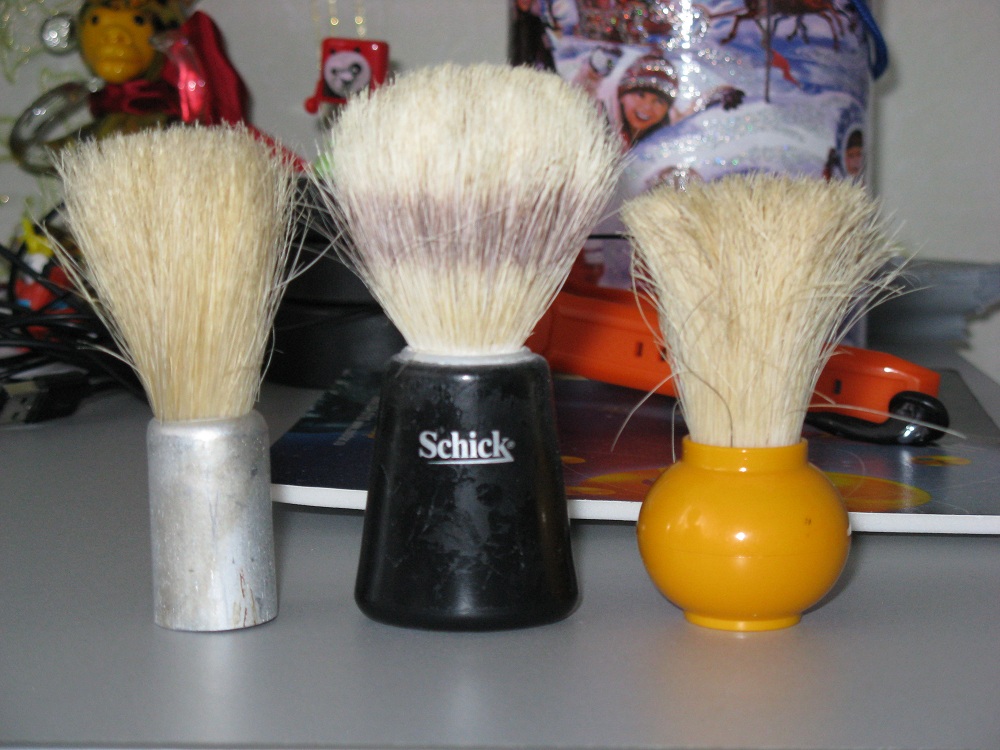 1. Купил на авито, нахлынула ностальгия по годам проведённым в ВУ, с армейских складов, гадость наипервейшая, лезет как больной стригущим лишаём. Обещания были, что ни один волос не упадёт. 2. Купил на рынке, у торговца принадлежностями для бритья. Помазков было много, этот самый дорогой. Пользуюсь наверное года три, но два точно. Тоже лезет, причём с первого дня, но меньше, чем первый и он приятнее в пользовании, мягче. 3. Купил наверное у какого-то прапорщика или контрабаса, но уже на Ганзе. Лучше чем первый, но тоже хуже чем второй, щетина слишком жёсткая и пучок маленький. Ещё один едет из Поднебесной, но уже из искусственного кабана, посмотрим, попробуем. Хотел купить дорогой какой-нибудь, но эти стояли копейки, а отдать 1500 руб, и получить разочарование, не очень хочется, пока обхожусь, может позже, после достижения дна кризиса....