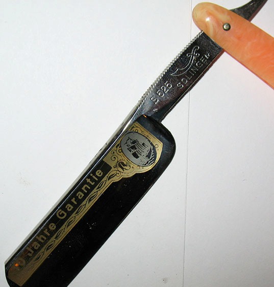Выпускалась она в 50-e годы для нескольких европейских стран (в т.ч. Франция, Великобритания, Италия, Швеция, Финляндия и др.), в связи с чем надпись, гласящая о 10-летней гарантии, "печаталась" на разных языках. Ручки были разных цветов, но позолота с травлением фрегата на клинке была на всех бритвах модели 525. Так же, как и металлическая вставка ERN из нойзильбера на ручке, и клеймо Silber-Stahl на обратной стороне клинка. ГДР-ом тут не пахнет, это верная бритва из Золингена Re: Выбор бритвы, помощь, консультация.Да что тут вазелинить, моя бритва уже,Для истории спрашивайте)