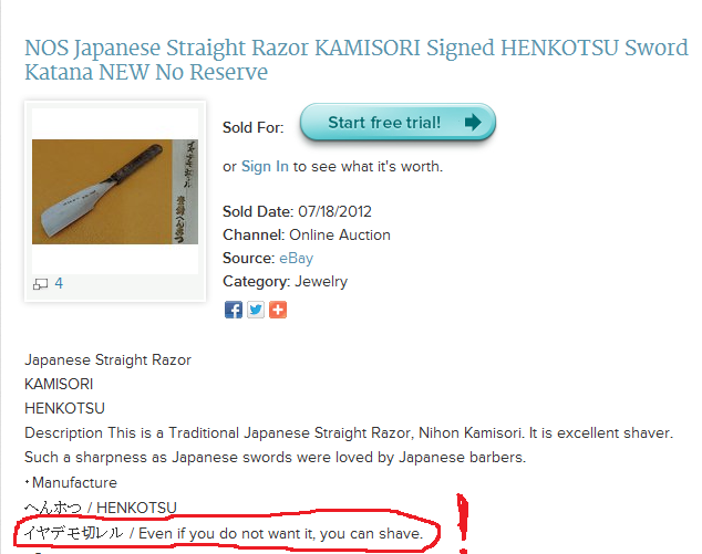 Надпись на обёртке перевели как : 高級本床向御剃刀 ( Kōkyū hon yuka kō kamisori ) "высококачественная парикмахерская бритва" Добавлено спустя 2 часа 6 минут 53 секунды: На бритве Кая сохранился остаток надписи : イヤデモ切レル(Iyademo kireru ) Забавно как её перевели на одном англоязычном сайте: "Даже если вы не хотите, вы можете бриться" К тому же очень грамотный японовед с Ганзы BurN, подтвердил правильность перевода: "イヤデモ切レル Если близко к оригинальному тексту то - "даже если не хочешь, бреет хорошо" (если просто передать смысл то - "всегда хорошо бреет").