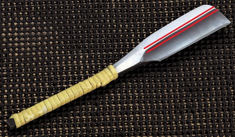 Либо просто неточеная - после первой заточки она станет точно такая же как в первом посте. Продают то они новую, но ЗАТЧОЕННУЮ. Т.е. специально перед послыкой затачивают и получается то что получилось. Вот на вашей же фотке я обвел на чт обратит внимание. Ширина режущей кромки - она переменна. Это говорит о переменной толщине самого полотна. И на спинку при заточке эти волны толщины перейдут троекратной шириной почти гарантированно. Я с этим часто сталкивался.