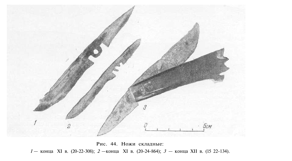 Бритвы. Древнерусские бритвы до новгородских раскопок были совершенно не известны. Бритва — специализированный нож для удаления волос — появилась в глубокой древности, вероятно, еще в неолите. Она была распространена в бронзовом и железном веках. Очень широко применялась бритва в античности 2в. По иконам и другим памятникам изобразительного искусства древней Руси известно, что в XII и XIII вв. на Руси была мода брить бороду и усы. И именнов слоях XIII в. на Неревском раскопе найдено 10 бритв. Хронологически и по форме они делятся на 2 типа (рис. 45). Первый тип — маленькие бритвы с ручкой в виде петли, заключенные в железный футляр. Эти бритвы найдены в слое первой половины XIII в. (3 экземпляра). Второй тип объединяет более крупные и технически совершенные бритвы, закрепляемые на оси в деревянных или костяных футлярах. Бритвы этого типа встречены в слое второй половины XIII в. (7 экземпляров). Форма бритв первого типа и их размещение по ярусам приведены в табл. 16, второго типа — в табл. 17. Бритва первого типа с плавным дугообразным лезвием была свободно закреплена на оси в железном футляре, имевшем только две боковые стенки. Фиксирующего положения футляр не имел и бритва могла вращаться на все 360° (как современная бритва). В середине XIII в. эти бритвы заменяются более совершенными. Тонкое дугообразное лезвие бритвы свободно крепилось на оси в деревянном или костяном футляре. В бритвах этой конструкции обращает на себя внимание острота лезвия. Клинообразное в сечении лезвие имело угол резания а° в пределах 5 — 6°, а на бритве 12-14-453 он достигал 3,7°. Очень рациональна была и технология изготовления этих бритв. Технологически изучены бритвы 10-11-974 и 11-13-1044. На боковой поверхности лезвия был сделан макрошлиф с травлением на макроструктуру. На этих экземплярах широкое и тонкое лезвие было изготовлено из железа, а на режущую кромку клинка наварили стальную полосу. Ширина стальной полосы на обоих лезвиях равнялась 7 мм. Обе стальные полосы термически обработаны. Характеризуя качество бритв, следует отметить, что бритва 11-13-1044, отточенная после изготовления на ней макрошлифа, чисто и легко брала на руке сухой волос. Таким лезвием свободно можно бриться и в настоящее время.