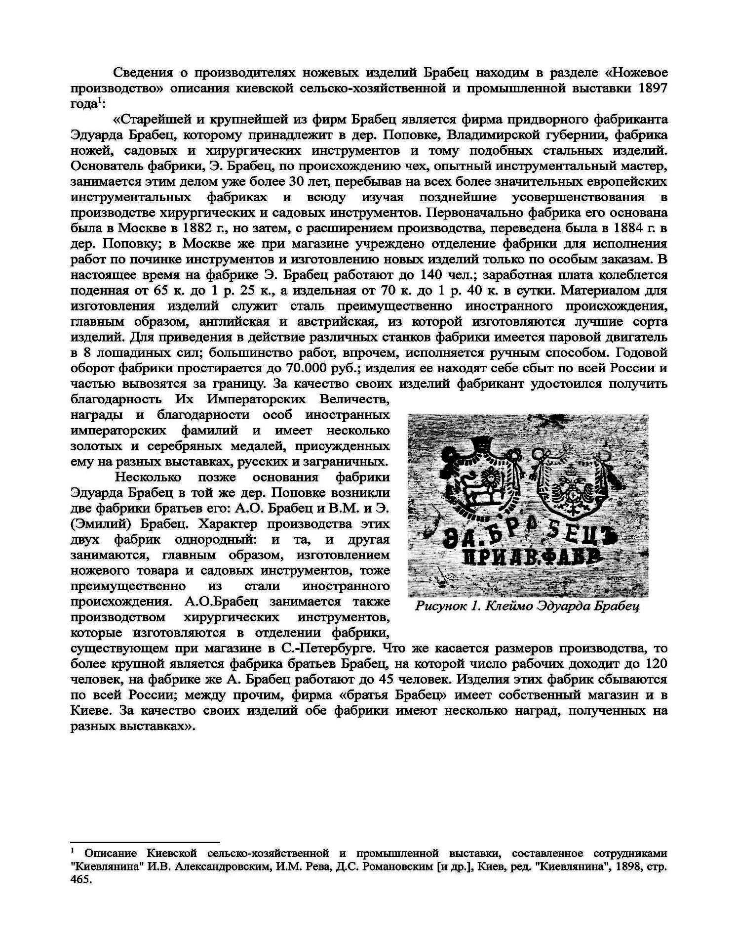 стальных изделий братья Брабец В дер. Поповке Владимирской губ. Муромского уезда. _________________________________________________ Главные заслуги процветания фабрики принадлежат основателю фабрики Матвею Оисповичу Брабецу и управ. фабр. Муромскому *******ну Е.Е. П*********. Производство: ножи, вилки, щипцы, кухонные приборы и проч. Годовой оборот до 40.000 руб. На выставках фирма получила много почётных наград. На Всероссийской Выставке в Нижнем-Новгороде 1896 года фирма награждена бронзовой медалью. Все говорят, что мы в месте…